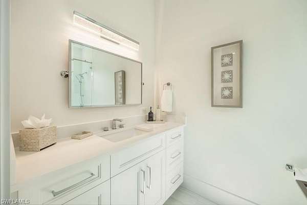 Welcome to Your Private Paradise in the Heart of Naples! Drive through the privacy gate into your own secluded oasis--2.27 acres of fully fenced and beautifully landscaped property that combines luxury, peace, and convenience. A palm tree-lined paver driveway leads you to this impeccably designed estate, offering the ultimate in indoor-outdoor living. The centerpiece of the outdoor space is a stunning custom pool with a spa, sun shelf, and dramatic fire bowls--perfect for relaxing or entertaining in a true resort-style setting. Enjoy the expansive covered outdoor living area, complete with an outdoor kitchen and fire pit, ideal for hosting family and friends year-round. Inside, the home features exquisite finishes throughout, including white oak wood floors, custom maple ceilings and beams, and a show-stopping kitchen with mixed wood cabinetry, Pompeii Venetta quartz countertops, and a large island perfect for gathering. This thoughtful split floor plan ensures both privacy and functionality. One oversized bedroom offers flexible use as a second master suite, in-law quarters, media room, or bonus space to suit your lifestyle. Tucked away in peaceful seclusion yet just minutes from Naples' finest beaches, restaurants, and shopping, this is truly a one-of-a-kind opportunity to own a luxurious retreat in one of Florida's most desirable locations.