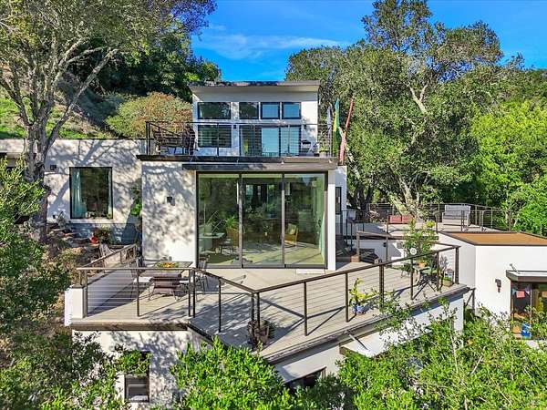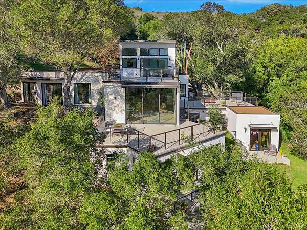 Incredible opportunity to own a stunning, newer built, custom modern estate with sun-filled Mount Tam views on approx. 50+/- acres within the charming town of Fairfax. This rare property sits close to town yet feels miles away, with access to the ridge top trails that wind through the rolling topography and scenery that make Marin County so special. On the property itself are multiple private walking trails that are wide and gently sloped, a fenced garden, an art shed and multiple gathering places, several with views of San Francisco, making this an amazing space for friends and family to retreat, recharge and explore the gorgeous land and views. The property includes two stunning and modern newer homes: a custom 4,457 sq ft main residence with 5 bedrooms, 4 full baths, a primary suite with a large view deck, a chef's kitchen, an oversized living room with 15' ceilings, radiant heated floors, walls of glass and stunning MtTam views, plus an infinity pool site with valley views. The separate 1 bedroom, 1 bath ADU offers modern finishes, radiant heat and its own light-filled living space. Should the new owner wish, this land also offers an exceptional opportunity to pursue a land-division strategy and notable development potential.
