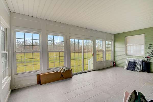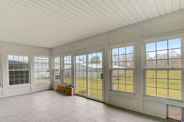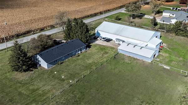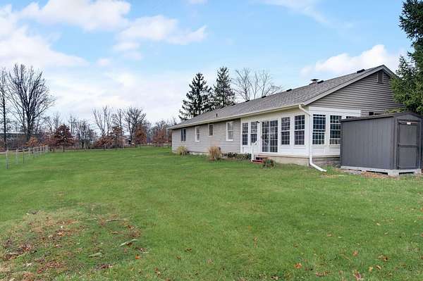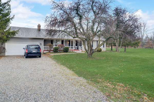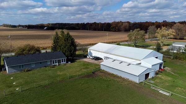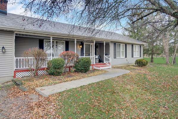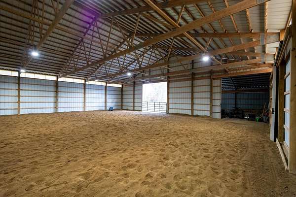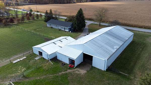 EQUESTRIAN ALERT! 5 acre horse property minutes from Del Co Fairgrounds120 X 60 indoor riding arena with new footing & energy efficient lighting, attached barn with 7 tongue & groove stalls fully matted, 5 turnouts with new fencing, & insulated storage shed. The house has 3 bedrooms, 2 baths, dining room, eatin kitchen, & wood burning FP. The full basement has 2 sump pumps Newer roof, Delco water, 2 car garage with new door, sun room enclosed porch viewing the pastures & lovely sitting front porch.