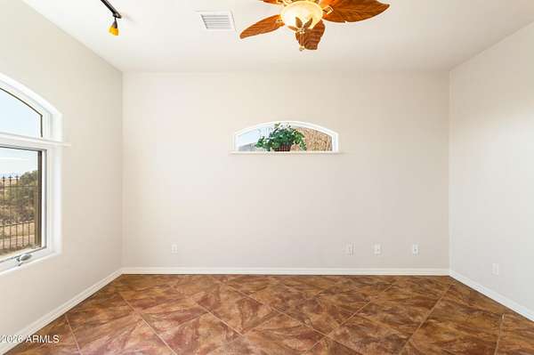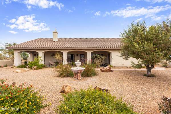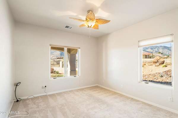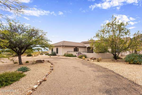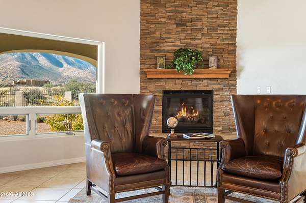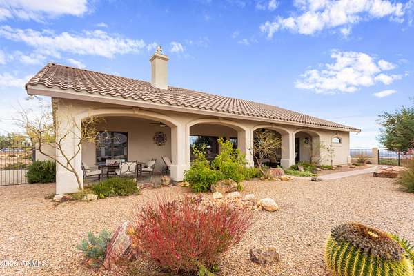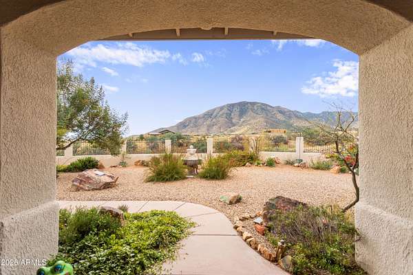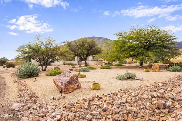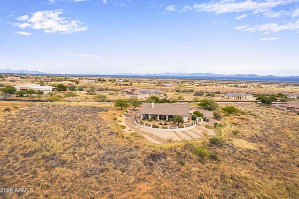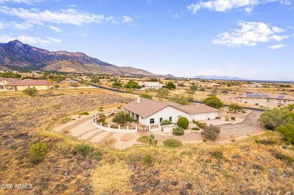 Gorgeous Walston custom home Wild Horse subdivision, perfectly situated on 3.5 acres with breathtaking 360 degrees mountain views of the Huachuca, Mule, and San Jose ranges. Professional landscaping enhances the horseshoe driveway and private courtyards with custom iron gates. Inside, enjoy Anderson windows, vaulted ceilings, granite countertops, a breakfast bar, downdraft cooktop, and custom Alderwood cabinetry with roll-out shelves. The living room features a dramatic floor-to-ceiling stone propane fireplace. The fenced backyard offers privacy, custom desert landscaping, and expansive views. Both bathrooms include granite and Alderwood finishes; primary bath featuring a snail shower, and semi-private toilet. Primary suite includes a versatile bonus room ideal for an office, gym, or retreat.