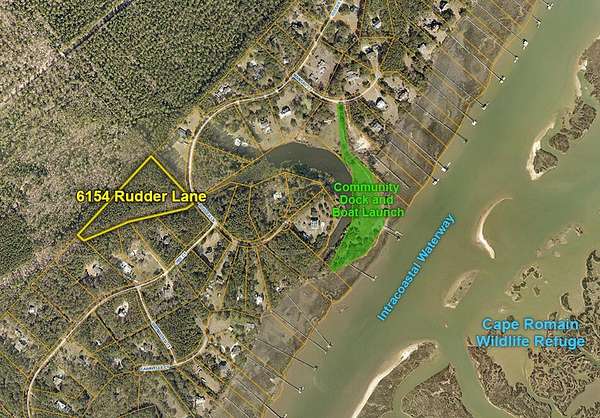 Ready to build your dream home in the country but live in a community full of outdoor amenities close to Mount Pleasant? With 6.34 acres, 6154 Rudder Lane is one of the few remaining tracts of land in Romain Retreat. Romaine Retreat is a gated 300 acre plus community with direct access to Cape Romain National Wildlife Refuge and Bulls Bay via private boat landing and dock for residents. This gives access to the Intracoastal Waterway and beyond for fishing, shrimping and crabbing adventures. There is also a covered and screened pavilion by the boat landing to enjoy outdoor feasts with friends and neighbors. It is only a 15 minute drive to Mount Pleasant's Roper Hospital, Costco, and Wando High School. You will enjoy creating your own quiet retreat to come and go from here.