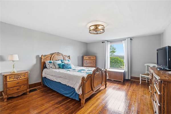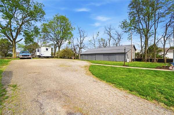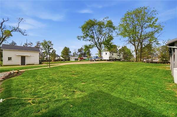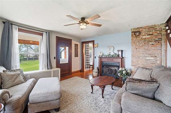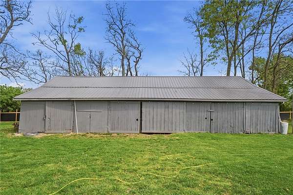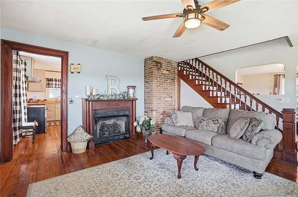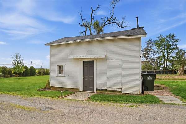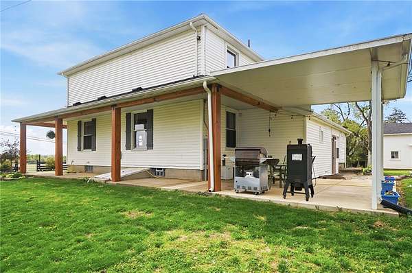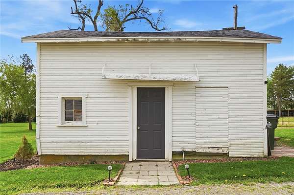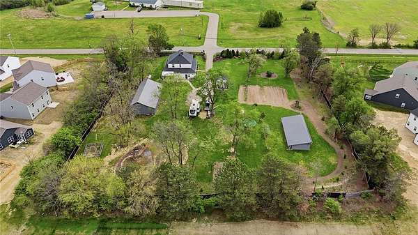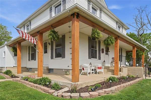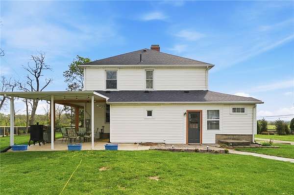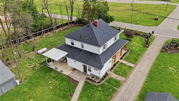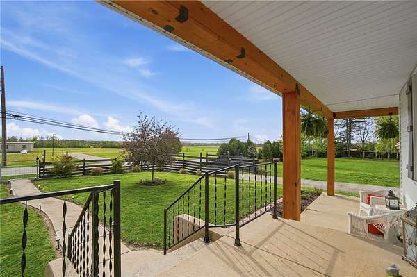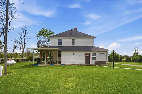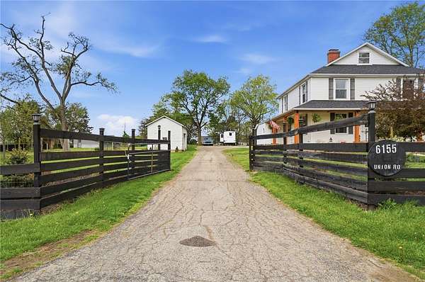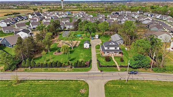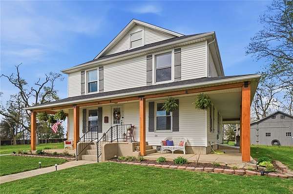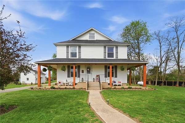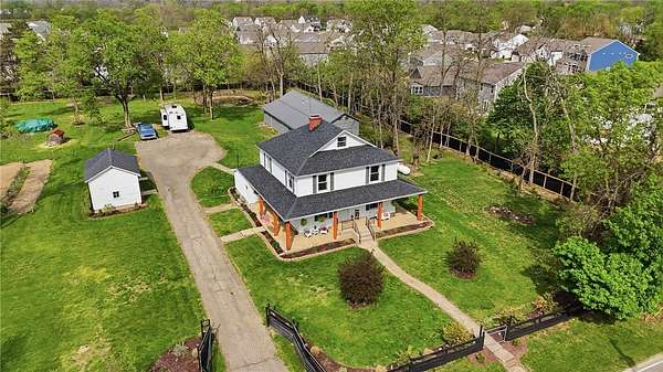 Picturesque American farmhouse with a wraparound porch, perfectly situated on 2.2 acres and offering exceptional privacy with a fully fenced yard, three barns/outbuildings and a pond. This charming home has been thoughtfully renovated while maintaining its modern farmhouse character, showcasing beautiful woodwork throughout. The kitchen features an abundance of cabinetry, a butcher block island, and plenty of space for gathering. The main level offers a formal dining room, living room, and family room, along with a full bath—providing flexibility to easily convert one of the living spaces into an additional bedroom if desired. Upstairs, you’ll find four spacious bedrooms and another full bath, while the third floor offers additional finished square footage with endless possibilities, including a bonus living area, bedroom, playroom, or study. Step outside to enjoy the covered back patio and peaceful surroundings. The property includes three barns, ideal for storage, hobbies, or equipment. Major updates include complete kitchen and main level full bath renovation, hardwood floor restoration, small barn paint & metal siding, large barn paint and rear metal siding, built and installed pond, major landscaping including 50 trees (including apple, peach, cherry and Asian Pear) & new flower beds, 3000 sf vegetable garden, 6ft fence - 3 sides - around entire property, front 4ft fence with gate, front porch fascia, new water pressure tank, newer vinyl siding, gutters, newer basement windows, updated electric and plumbing, newer well pump, water heater, water softener, and ceiling fans. Roof on home replaced in 2019, all three barn roofs were replaced in 2022, and the largest barn was structurally reinforced the same year. This truly one-of-a-kind property offers the best of both worlds—peaceful country living with the convenience of city amenities.