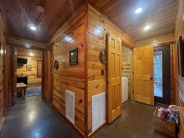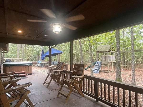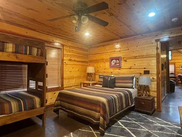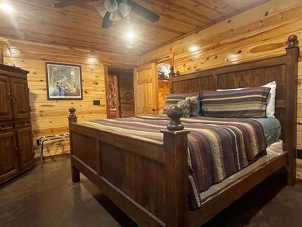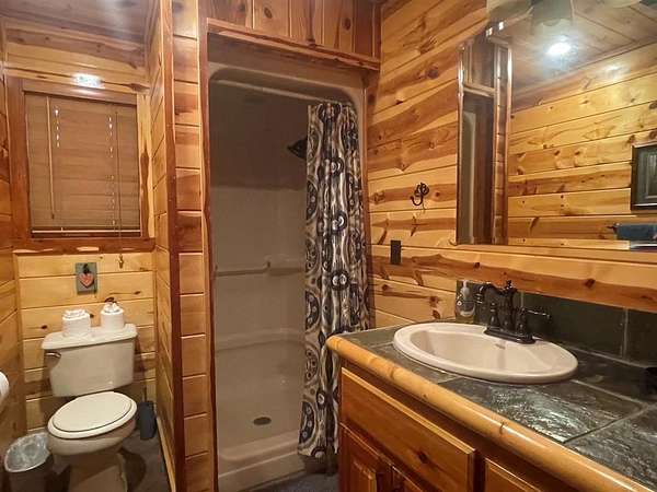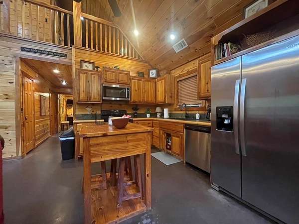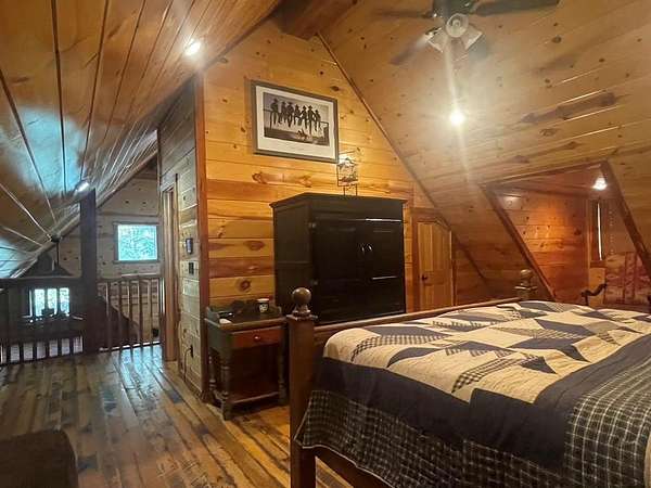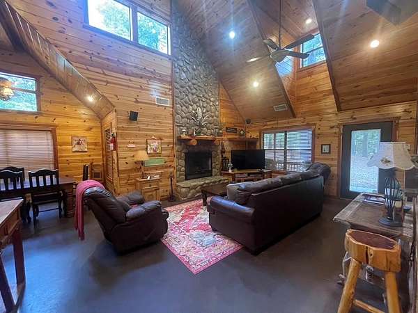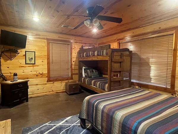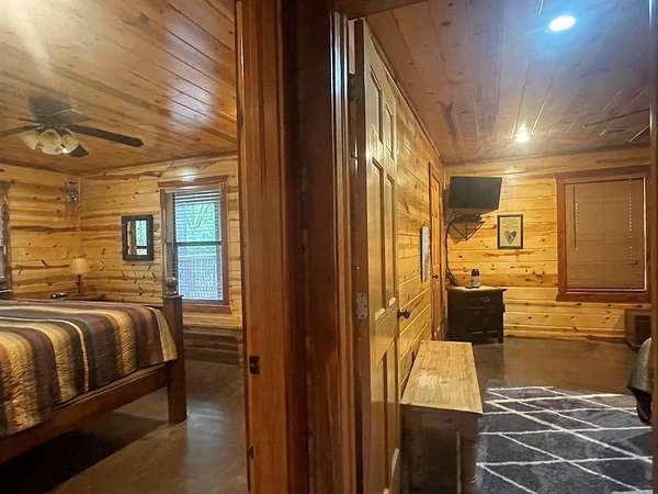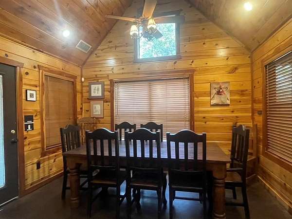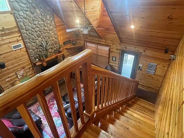 Welcome to the M Cabin, located in Southern Hills. As you walk in the front door you'll immediately notice the tall ceilings and unique architecture that makes The M a favorite of so many. The open concept kitchen and living area invites you to relax and enjoy all the comforts of home with plenty of space for family and friends.The downstairs offers one master suite and bath, one bedroom with a bunk bed and a shard bath for guest.The upstairs loft is a hidden gem within the cabin which features it's own private bathroom and enough space for extra bedding! The back yard area of the cabin offers a playground set for children and a fence you can close off for pets or your little ones to play in. The spacious deck in the back of the home has plenty of room for large gatherings, which makes a great family cabin. The cabin has a well on site and needs some TLC. If you are looking for a project and want a spacious and inviting cabin that sits on 1.68 acres this is the place to purchase. It's an interior designer dream to give a rustic cabin a modern feel. Plenty of room to build a swimming pool or add your own pickle ball area. This cabin has so much potential and could be a good money maker, located in a high tourist area.