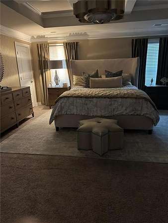 Upstairs, the oversized primary suite is a true private retreat featuring a coffered ceiling, a private fireplace, and a separate sitting room. The spa-inspired primary bath offers a separate soaking tub, a beautifully tiled walk-in shower with double shower heads, tile flooring, and a huge walk-in closet.