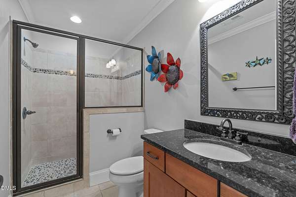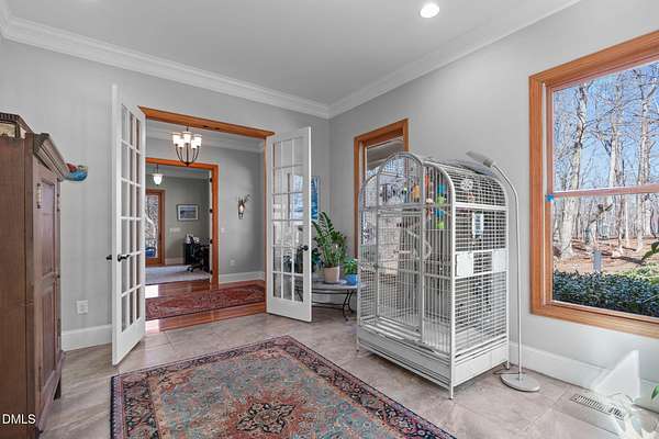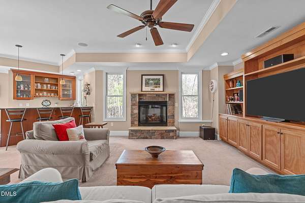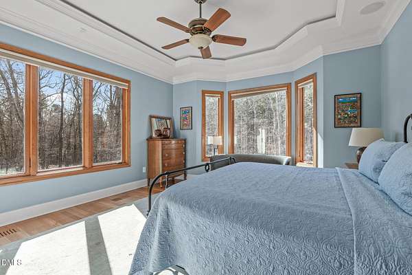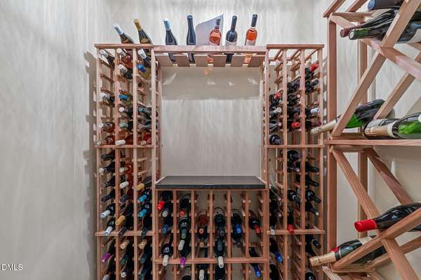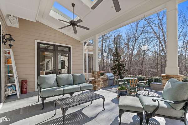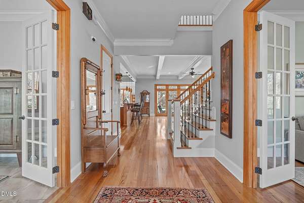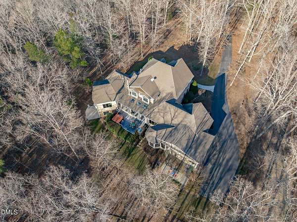 Stunning 6,000+ square-foot estate nestled in the heart of Chatham County, located midway between Chapel Hill and Pittsboro - 15 minutes either way. Privately gated driveway at the end of a road and set on 4.5 beautifully landscaped acres, this exceptional home offers luxury, comfort, and thoughtful design throughout. The main-level primary suite is a true retreat, featuring dual spa-like bathrooms connected by a striking walk-through shower with dual shower heads. The chef's kitchen showcases high-end custom cabinetry, premium countertops, and Dacor and Bosch appliances, all opening to inviting living spaces accented by Australian wormy chestnut hardwood floors throughout the home. Gas log fireplaces warm both the main living area and basement, while a wood-burning fireplace enhances the covered patio for year-round enjoyment. Upstairs, an open loft and living area includes a convenient coffee bar with sink and refrigerator. The upstairs is rounded out with 3 large bedrooms, 2 full baths (one ensuite), and access to a Juliette balcony. The walk-in attic space is over 1,200 square feet. The finished basement is ideal for entertaining, complete with a full-size bar, sink, and dedicated wine cellar room. There is also a flex space that serves as a spacious fitness center, hobby room or an extra bedroom. A full-size bathroom and multiple storage rooms are also accessible, along with a walk-out to the backyard. Built-in bookshelves flank the custom fireplace in the main living area, while a flexible space currently used as a sunroom offers the option of a formal dining room. A private office near the entry features direct access to a screened porch and the covered front porch. Outdoor living is exceptional, with an oversized screened porch designed for optimal air flow, a covered patio featuring custom tile and fireplace, and a deck with built-in grill and hot tub (conveys). The 3 car garage includes a built-in dog shower and lots of space for storage cabinets. Recent updates include fresh interior and exterior paint, new HVAC systems (main level and basement in 2025; upstairs in 2024), and a hot water heater replaced in 2024. Additional features include a whole-house generator, water softener, and reverse osmosis system in the kitchen. A rare opportunity to own a private, impeccably maintained luxury home in one of Chatham County's most desirable locations.