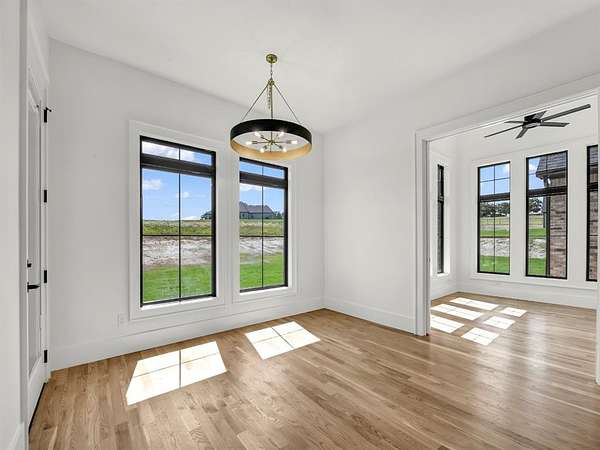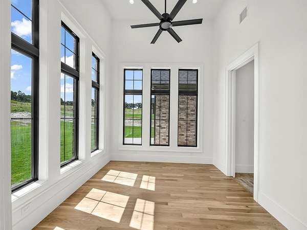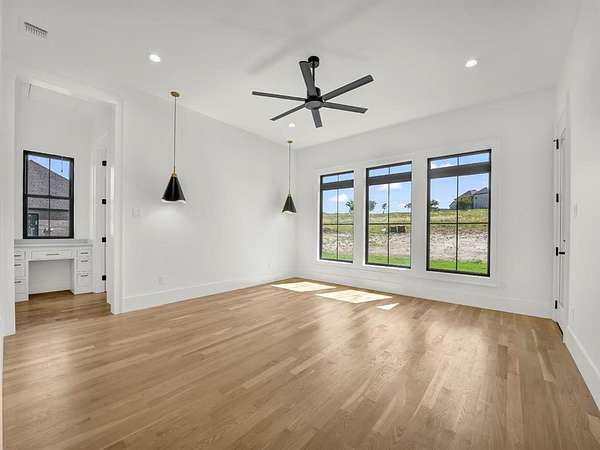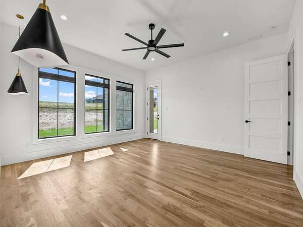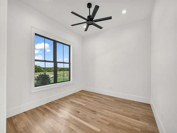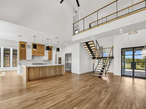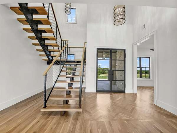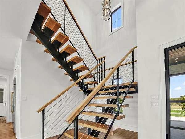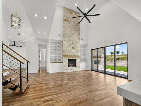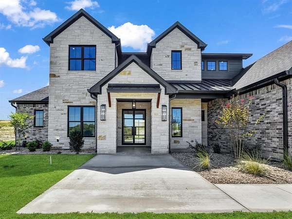 Builder offering interest rates as low as 5%--an incredible chance to lock in luxury at a lower rate! Welcome to 3,341 sq ft of pure sophistication in one of Brock ISD's most prestigious neighborhoods, Santana Ridge Estates. This stunning 2-story home was crafted with every detail in mind. Enter through steel-framed glass double doors into a grand foyer that sets the tone for what awaits. The open-concept great room is anchored by a 22-foot ceiling and a dramatic floor-to-ceiling stone gas fireplace with floating mantle. Just beyond, a covered patio with wood-burning fireplace offers the perfect retreat for year-round entertaining. The chef-inspired kitchen is a showpiece, boasting quartz countertops with a waterfall backsplash, bold 2.5-inch drop-edge island, GE Cafe appliances, 48-inch dual-fuel commercial-grade range, built-in oven & microwave, hidden walk-in pantry & champagne bronze accents. Oak hardwoods flow through main living areas, while the mudroom & laundry add warmth with brick flooring & custom built-ins. The primary suite features a spa-like bath with dual shower heads, soaking tub & designer finishes. Two main-level flex rooms add convenience as an office, sunroom or play space. A floating steel-beam staircase with white oak treads & cable railings leads to the upper level, where an expansive loft & catwalk overlook the great room. Upstairs offers a 2nd primary suite, 2 bedrooms joined by a Jack & Jill bath & an added laundry space. A large 2-car garage plus a drive-through single-bay shop with portico provide unmatched versatility. Added features include black-framed windows, tankless water heater, 250-gallon buried propane tank, private well, aerobic septic, ATT fiber & buried utilities. Located just 10 minutes south of Weatherford in Brock ISD, this home embodies the pinnacle of luxury living--where design, comfort & craftsmanship meet the moment you step inside. Call us today to make this home yours!