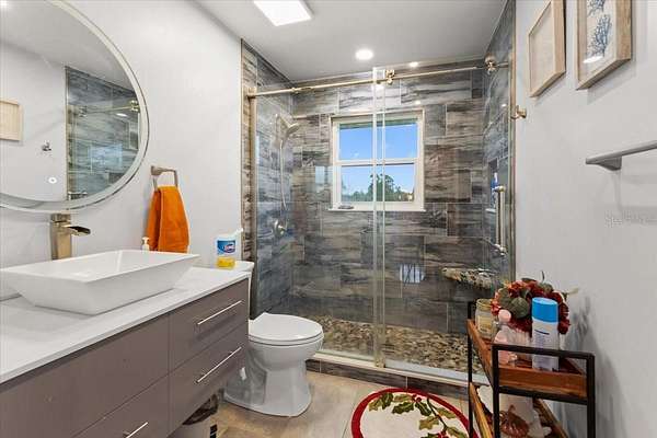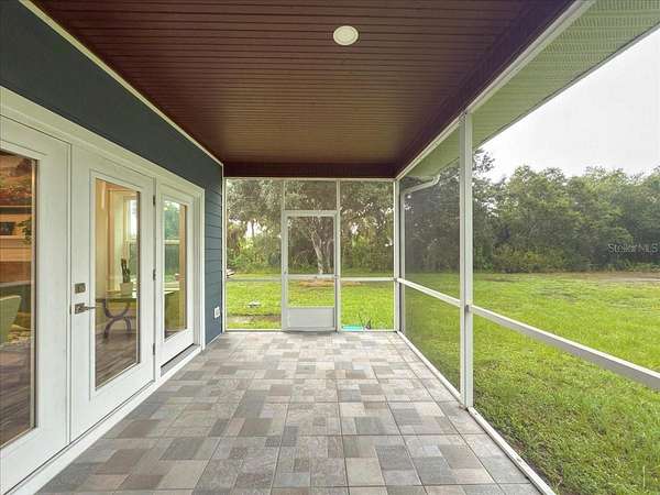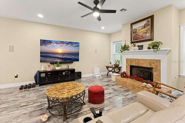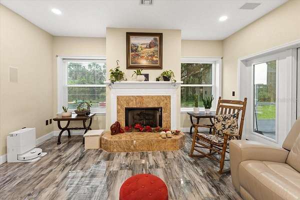 The home's complete exterior transformation includes a brand-new roof, impact-rated windows and doors, Hardie board siding, soffits, fascia, gutters, updated ceilings, new light fixtures, and fresh paint. Two new Trane air-conditioning systems ensure year-round comfort and efficiency.