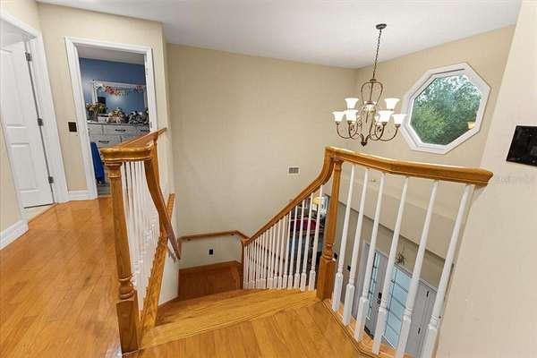 A grand two-story foyer opens to formal living and dining areas, a spacious family room, and a gourmet kitchen with breakfast nook. Designed for entertaining, the home also offers a wraparound porch overlooking the grounds. Custom features such as oak wood flooring, a handcrafted oak staircase, soaring volume ceilings, crown molding, plant shelves, decorator lighting, window treatments, and color accent walls elevate the interior. A dedicated laundry room with cabinetry, pantry, work counter, and utility sink adds convenience.
