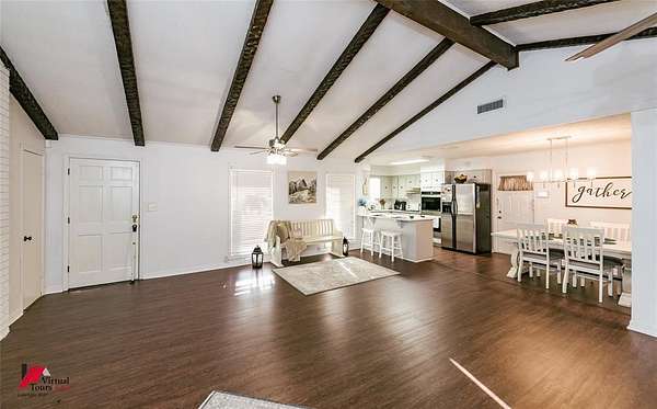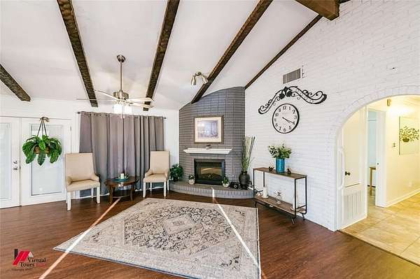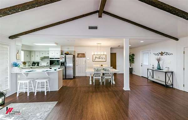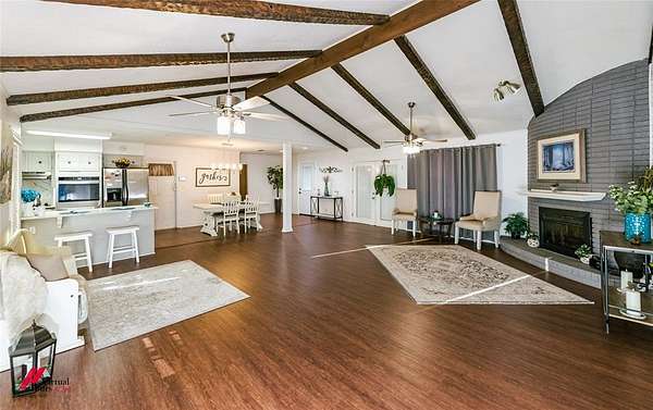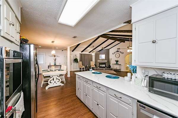 Step through the front door and into an inviting open-concept living and kitchen space highlighted by exposed ceiling beams and a cozy wood-burning fireplace that anchors the living room. The kitchen is both stylish and functional, featuring marble countertops, a breakfast bar, double oven, new dishwasher, and abundant cabinetry--perfect for everyday living and entertaining alike.