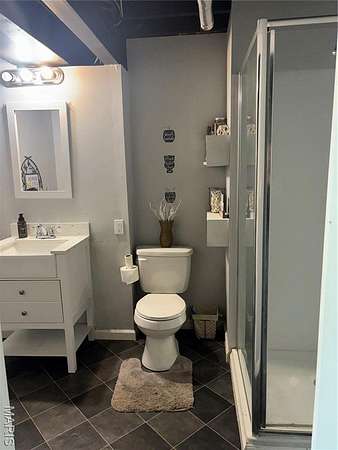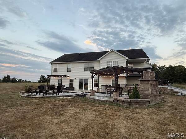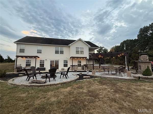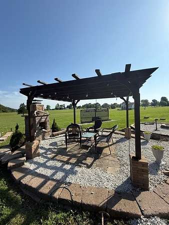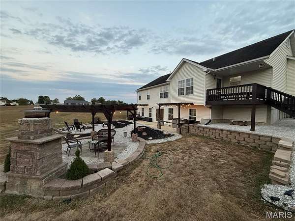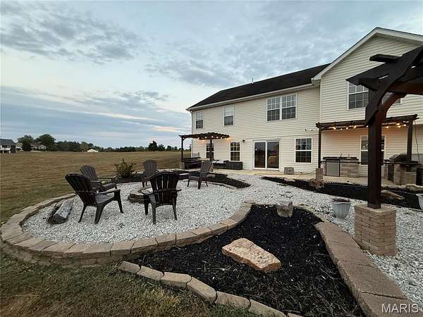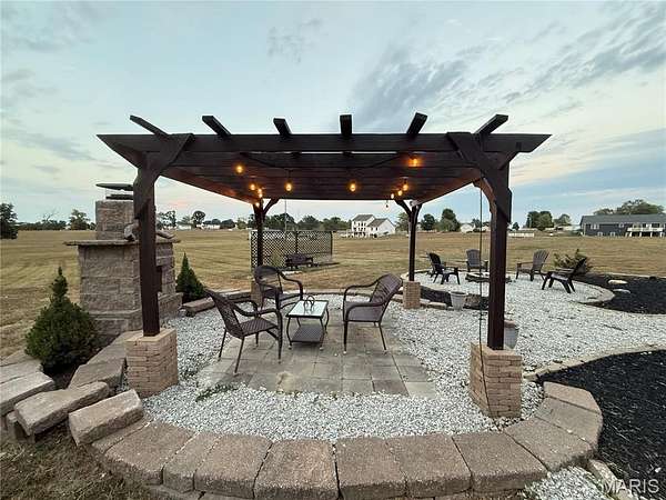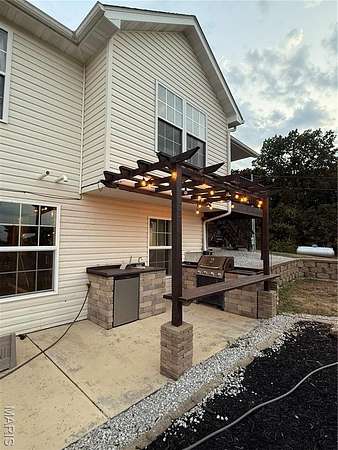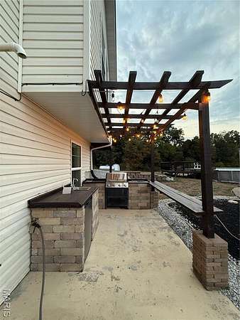 OUTSIDE KITCHEN with furnished patio, stainless steel mini fridge and sink, pizza oven and firepit under a pergola, walk-out partially-finished basement to add more living, entertaining or storage space! Included in the basement is a detached electric fireplace with 2 bedrooms. Bathroom in basement with walk-in shower and tile. Perfect home for entertaining guests and outside fun with plenty of room!