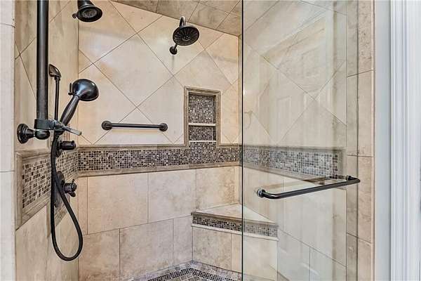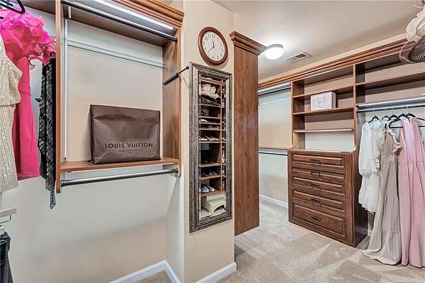 On the second level, the spacious primary suite includes a luxurious bathroom with travertine flooring, cherry cabinets, granite counters, a frameless shower, and a spa-style soaking champagne bubbler tub. The walk-in closet has custom cabinetry and even lock and key drawers. There are 3 additional bedrooms and a large bathroom on the upper level.