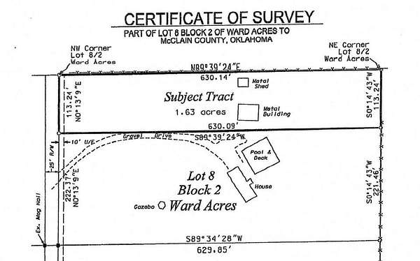 Brand new lot split available in Blanchard! This 1.63 acres is surveyed and approved with the City of Blanchard. The ink has barely dried on the newly issued address of 6188 Ward Acres. See supplements for Survey from Lot Split. With access from Ward Acres Road, you do not have to worry about any easement or rights of access. With all the possibilities available to you in building your new home, you will already have an impressive 40' X 30' workshop on site with 2 overhead garage doors, block and tackle lift for engine work, metal frame exterior, cement floor, and its own meter and electric. Property will need to be connected to Blanchard Water and Sewer. Area has access to fiber optics. Fencing runs along the North and East edges of the property only. Property also includes a metal frame chicken coop and beautifully wooded. To close with First American Title as title work and deeds for lot split have been prepared there.