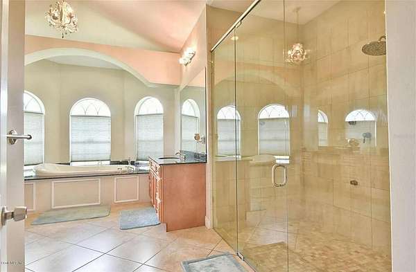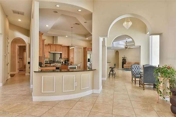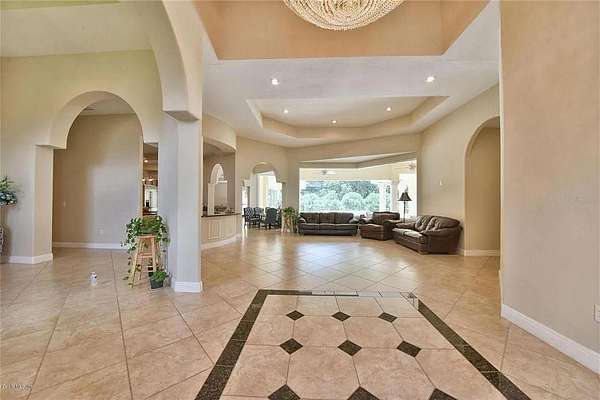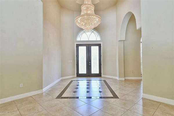 The Mediterranean-style residence boasts over 6,800 total square feet with 5 bedrooms and a split floor plan designed for comfort and privacy. A grand foyer with a handcrafted chandelier sets an elegant tone, while soaring ceilings and expansive windows fill the home with natural light.