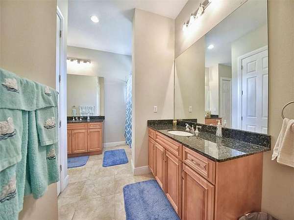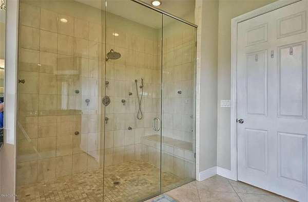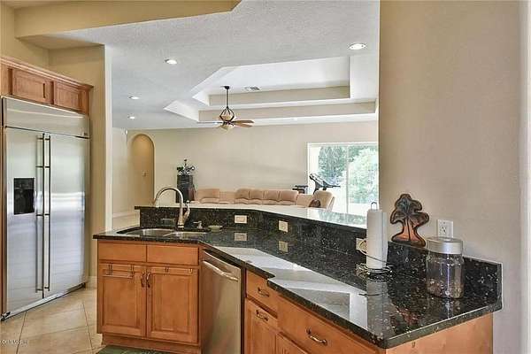 The kitchen features stainless steel GE appliances, a wine cooler, and a welcoming eat-in area. The primary suite offers a private retreat with tray ceilings, a sitting area, and direct access to the pool deck. The en-suite bath includes a large tiled walk-in shower, garden tub, and spacious his-and-hers walk-in closets.