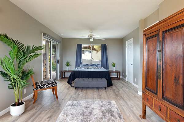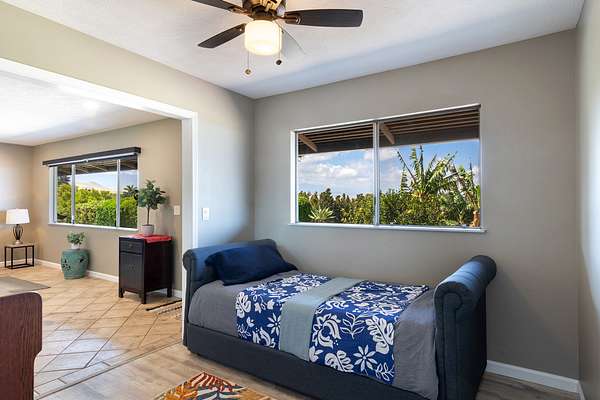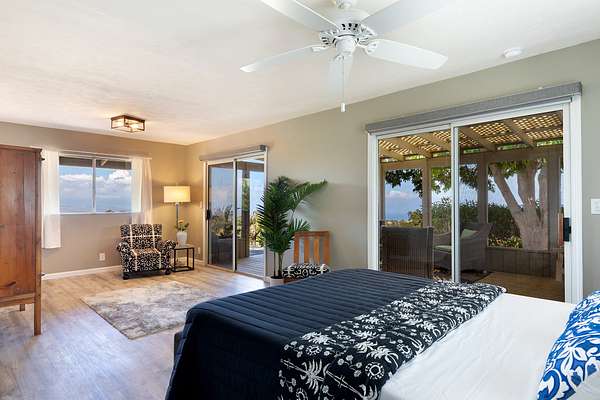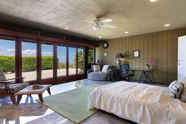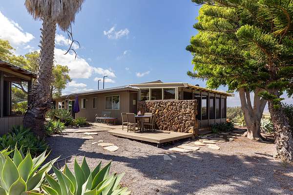 Welcome to this 3 bedroom / 2 bath with separate OHANA, air-conditioned home in the highly desirable Kanehoa subdivision. With EXPANSIVE OCEAN VIEWS of the Pacific Ocean and Kohala Coast as well as the majestic mountains of Mauna Kea, Mauna Loa, and Hualalai, you'll be sure to enjoy sunset views year round. With 1,584 square feet of freshly painted living space, the home features two permitted bedrooms (easily converted to three) and two bathrooms. With an open floor concept, the main entrance into the home has a spacious living room off the kitchen with bar seating as well as room for a dining table. Updated galley style kitchen has updated countertops, large single basin sink, stainless steel appliances and lots of counter space. Laundry room and second bath are just right of the kitchen. The spacious primary bedroom with two separate closets enjoys stunning views of the Kohala Coast, and opens to a private, covered, and screened lanai-an ideal spot to relax and take in the sunset. Property has multiple exterior areas to entertain, garden, star gaze, or enjoy the ocean and mountain views. Adding to its unique charm, an outdoor pavilion-perfect for use as a sleeping cottage-completes this peaceful and private retreat. Very charming Ohana with a private entrance and separate parking has a bathroom with its own washer dryer, small kitchen, and lots of windows with natural light. Ohana is attached to the garage. One half of the garage has been used as office space and family room; certainly multi-functional. Excellent RENTAL INCOME opportunity! Tucked into the hillside, the home blends beautifully with its natural surroundings, with drought-tolerant landscaping. Ideally located at a comfortable elevation on Waimea's dry side, this property offers easy access to both Waimea town and the white sand beaches of the Kohala.