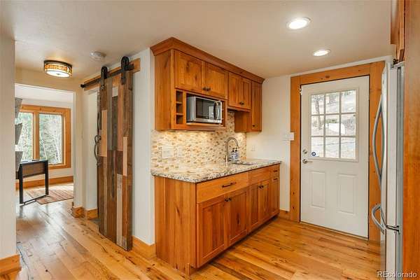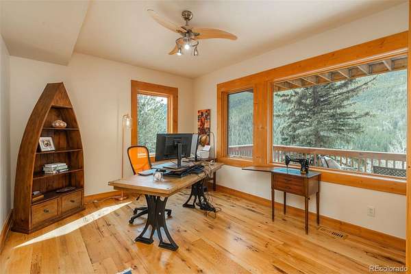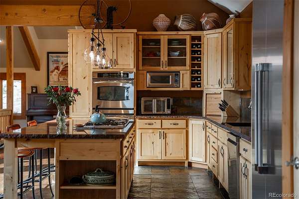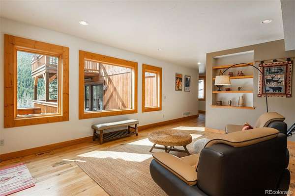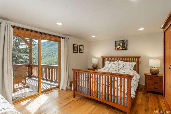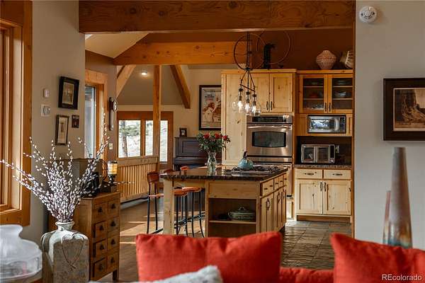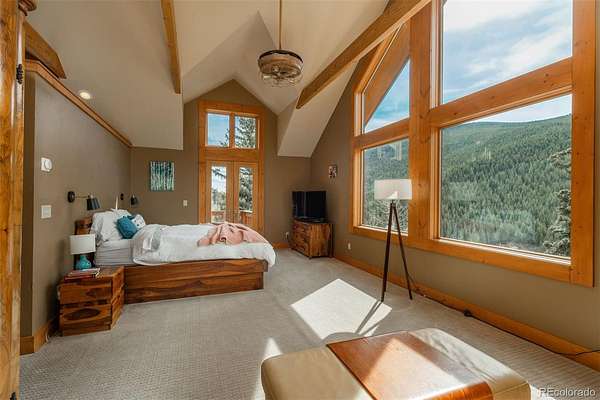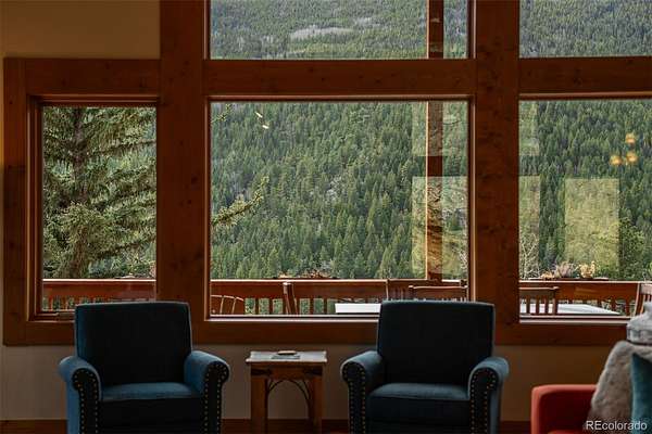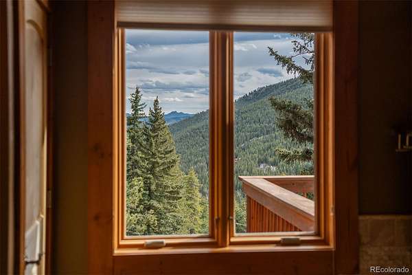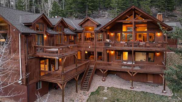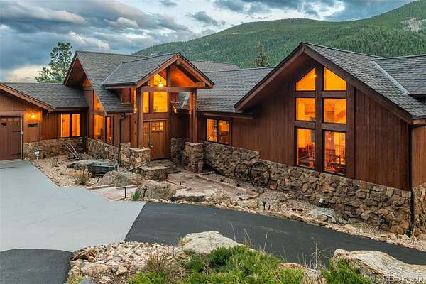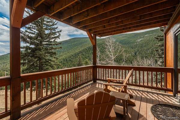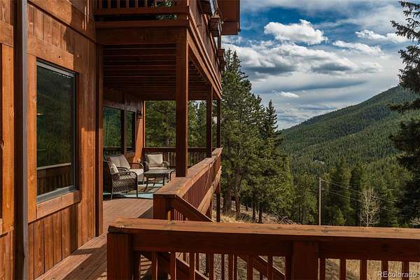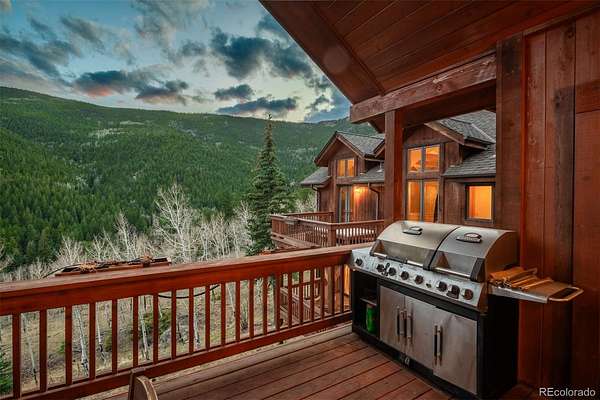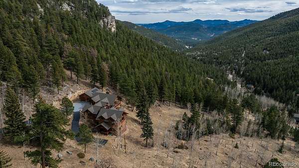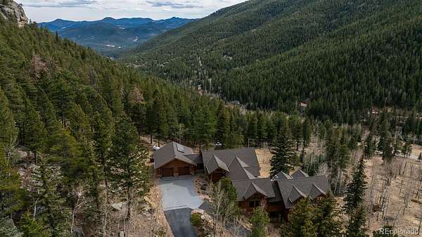 Active solar and EV charging station are wonderful bonuses to this main level living 2005 built timber frame that sits on a gentle 3.74 acre lot surrounded by mature aspen and oriented toward massive mountain views. Located far enough away so you can hear a pin drop, but still within an hour/5 mins to D.I.A. and 20 mins to groceries and restaurants, this home offers vaulted open rooms with walls of glass framing pristine treed mountains, a hillside of rock outcrops and distant layered vistas. Visiting elk, deer, fox and other forest friends are to be enjoyed from the dramatic two tiered wrap around wood decks. Double door slate entry opens to an immense living room with moss rock wood-burning fireplace, exposed beams and framed walls of glass. Gorgeous wide plank hardwood floors plus alder doors and trim grace the living areas, complimenting the timber frame design and custom lighting. Kitchen has slab granite counters and provides inspiring views along with a center island with bar seating; high-end appliances including stainless side-by-side refrigerator, 5 burner gas cooktop and double GE Profile convection wall ovens; glass front wood cabinets, pantry closet, an organization center and access to view deck. Vaulted formal dining room holds space for China closets and buffets for serious entertaining. Primary suite is enveloped by views featuring a towering wall of glass, private deck, walk-in customized closet, 5 piece slab granite/travertine bath with jetted tub and frameless walk-in shower. Walk-out level has a stunning separate suite with oak hardwood flooring, a kitchenette, custom barn doors, marble walled 3/4 bath, office and a family room with stone surround wood burning fireplace that opens to the bedroom and offers double sliding doors to the wraparound decks. Sunny den leads the way to a tiled 1/2 bath and two more bedrooms that share a full bath. Underneath the home is a 320 s.f. storage room accessed from the back stairs. Partially heated driveway.