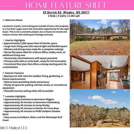 Welcome to 62 Derrick Rd in Wiggins, a property offering a peaceful rural setting with the space and location to support a renovation opportunity. This home presents potential for buyers looking to personalize or reimagine a property while enjoying country living just minutes from town. Interior photos are virtually enhanced. Property is being sold in its present condition and requires clean-up. The existing layout offers flexibility for future renovations, with a spacious lot that allows room for outdoor living, gardening, or additional enhancements over time. The setting provides privacy and a quiet atmosphere while remaining conveniently close to shopping, dining, and major roadways. Conveniently located near local amenities and within easy driving distance of larger employment and military hubs, this property offers a balance of rural surroundings and accessibility. Showings are available by appointment only. Please do not walk the property without a scheduled showing.