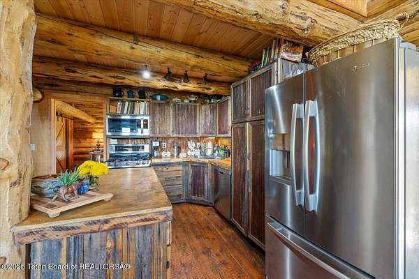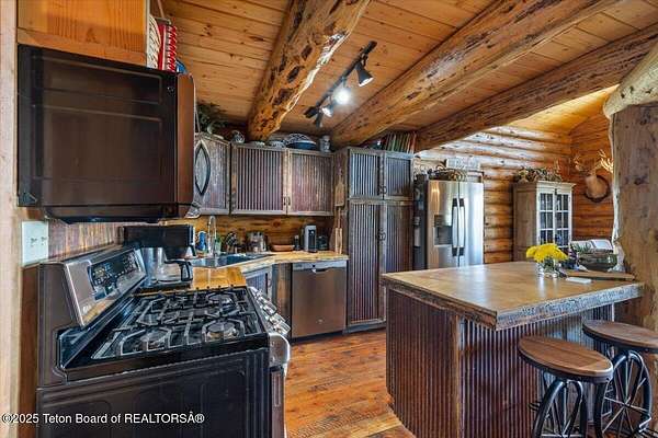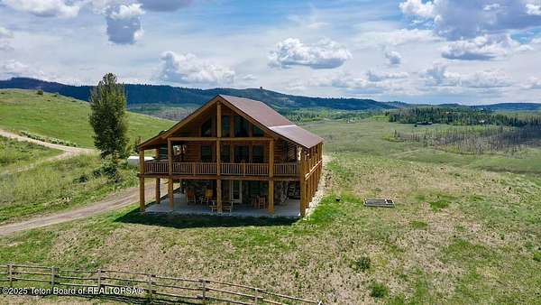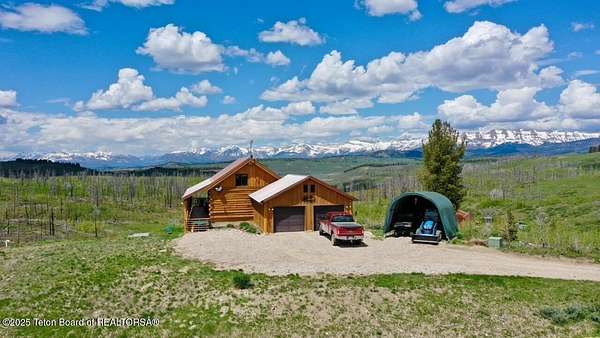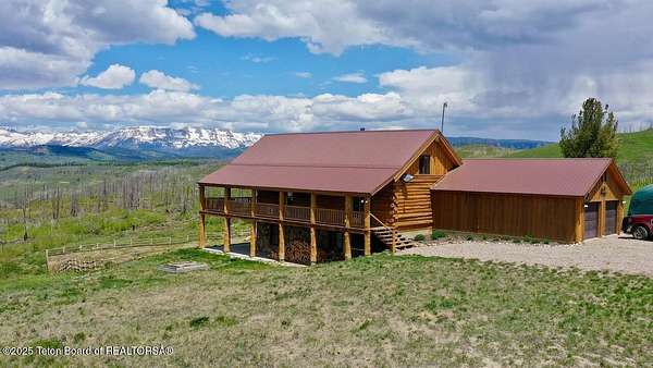 Discover this handsome custom log home, hand-built in 2015 & impeccably maintained. Perched atop a ridge on 8.32 acres, it borders the Bridger Teton National Forest, just 60 minutes from Jackson & Pinedale. The main living area boasts vaulted ceilings & floor-to-ceiling windows, framing breathtaking views of the Gros Ventre Mountain Range. A grand stone fireplace, circle-sawn heart pine floors, & skip-peeled logs craft a warm, inviting mountain retreat. Home features include 2342 SF with 3 en suite bedrooms, two living areas, a craft room, walk-out lower level, custom cabinetry, 750SF garage, combination shop/hay shed, corral for horses, ShelterLogic carport, a 2023 hot tub & the home is furnished. Experience rustic luxury in a serene setting.