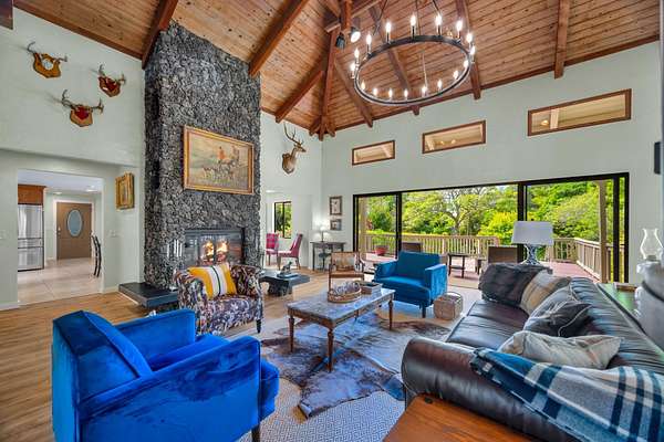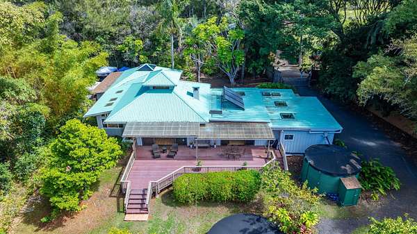 Welcome to your ultra-private, gated sustainable tropical paradise at 620 Awalau Road, Haiku! Nestled on two beautifully landscaped acres, this charming home is a haven of serenity and wonder. Enjoy the bounty of organic fruit trees and a peaceful lily pond with captivating ocean, mountain, and valley views. The main house offers a spacious 2,787 square feet of living area, featuring three delightful bedrooms and two bathrooms. A stunning lava rock fireplace graces the Great Room, which, along with cork-underlay hardwood floors, is perfect for yoga or dance enthusiasts. The Primary Suite, boasting a separate entrance, a luxuriously remodeled bath, and kitchenette sets a tone of elegance and convenience. Unleash your creativity in the dedicated octagonal art studio, equipped with a covered lanai, bathroom and a bonus outdoor shower. With a second studio poised for artistic endeavors, the possibilities are endless! Imagine future gatherings on the large lanai or adding a charming cottage, with breathtaking views of the expansive gulch and ocean. This Haiku gem is complete with a garage, plenty of additional parking and conveniently close to Makawao, Haiku and Paia towns. Embrace tranquility and creativity in your new home!