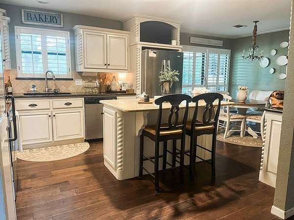 KITCHEN showcases granite counters, a storage-packed island with power, butler's pantry, custom coffee bar, and a bright breakfast nook with plantation shutters. Separate formal DINING ROOM features a BAY WINDOW and statement CHANDELIER. Living room anchored by a floor-to-ceiling stone propane FIREPLACE.