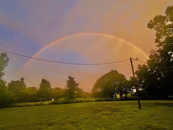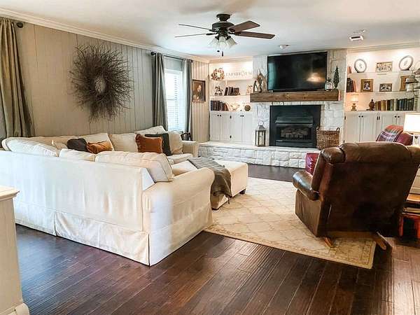 Country setting with polished upgrades and mature shade trees on a level two-acre lot.