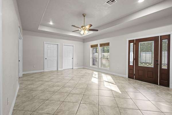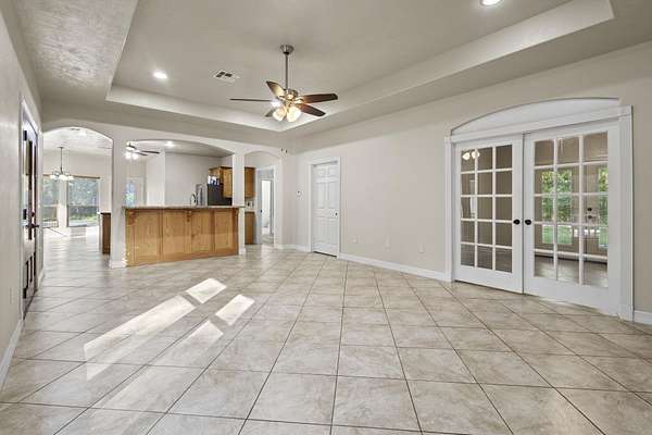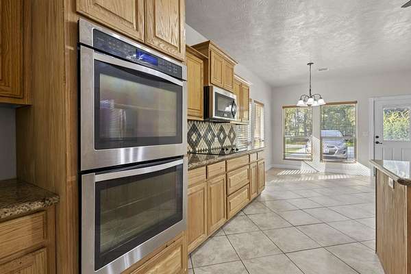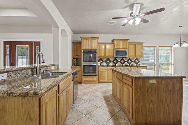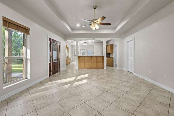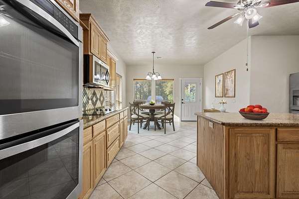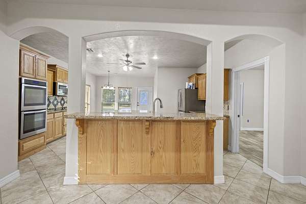 - Blinds/Shades, Built-In Oven, Ceiling Fan(s), Cook Top, Granite Counter Tops, Inside Utility Room, Open Concept, Sheetrock, Split Bedroom Plan, Tile Floors