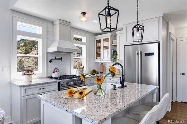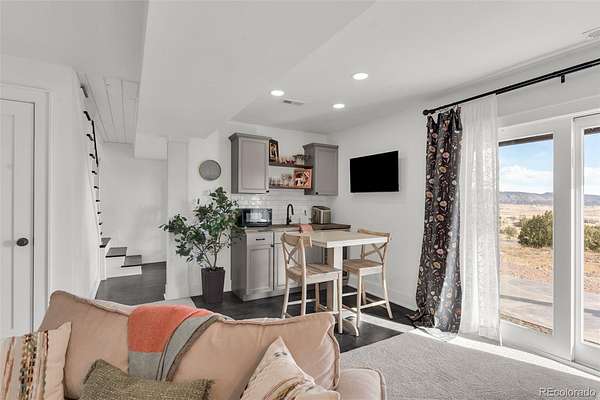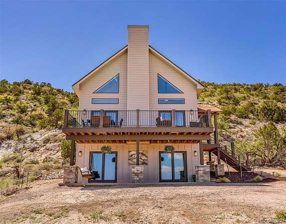 Gorgeous mountain cottage perched on 35 acres 7 minutes to downtown. Gated, private valley with sweeping views of Canon City and the surrounding mountains. Every detail is custom quality on this builder's home. Partially fenced for horses. Custom timber post frame barn has been plumbed for radiant heat and a future bathroom. Possible ADU? 3 bedrooms and 3 bathrooms plus loft, rec space and full kitchenette make this home truly fun and functional. Basement could potentially be rented separately. There is an RV pad with utilities available. The lower level mudroom entrance is beautiful yet functional on those rainy or snowy days. 26' ceilings and wall of windows create a stunning sense of drama in the great room area with great passive solar! The spacious upper level Owner's loft boasts a gorgeous bath and a walk-in closet w/ custom shelving. The kitchen is a cook's delight with a 30" commercial style range and an adjacent walk-in pantry. Blown insulation and HE HVAC provide very low utility bills. The deck affords what are some of the best views in town. A bladder water capture system allows the patio below to stay dry during the rain. The exterior siding is LP Smartside, soft glow landscape lighting. Seller will build a detached garage, up to three car, for the buyer at an agreed upon cost. The home can also be sold furnished for a turn key vacation home or STR! The property is very picturesque, blanketed in sunflowers and many other species of cactus and wildflowers. Unique rock formations and remnants of its rich mining history including the evidence of digs, overburden and the original mining cart path are present. It would make a great STR, equestrian STR, possible wedding venue, boarding facility, vacation home or a beautiful primary residence! Walking distance to trails. In a world full of exaggerated AI descriptions, this beautiful home truly is a must see!! PLEASE refer to the room sizes and sq ft prior to showing. Please allow 24 hour notice for showing.