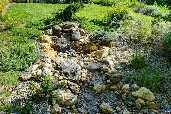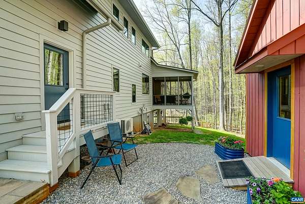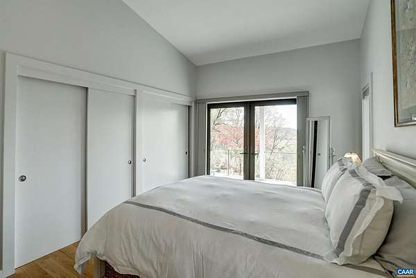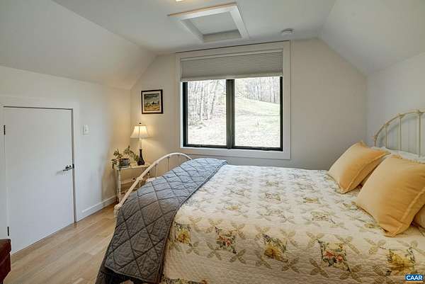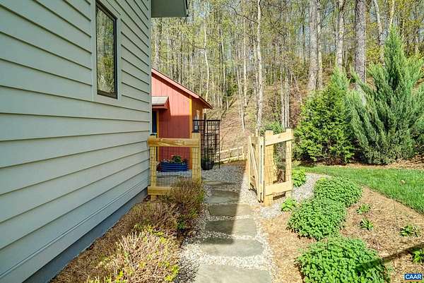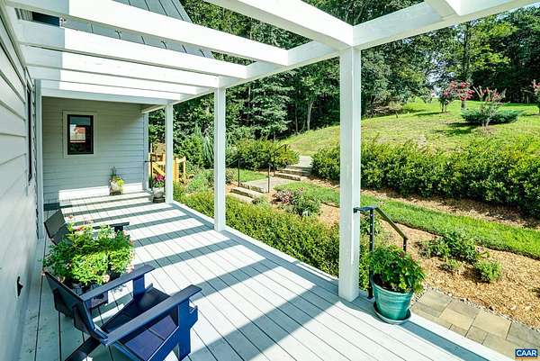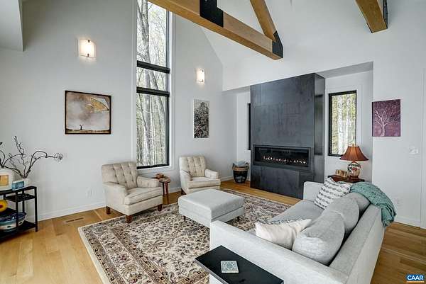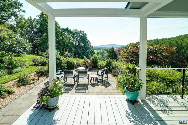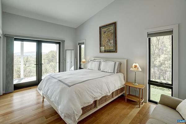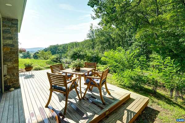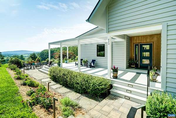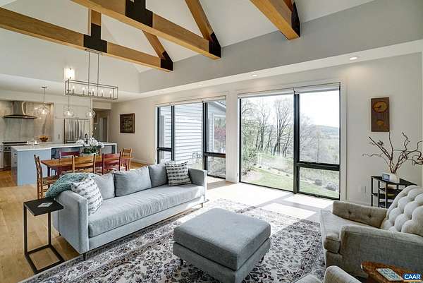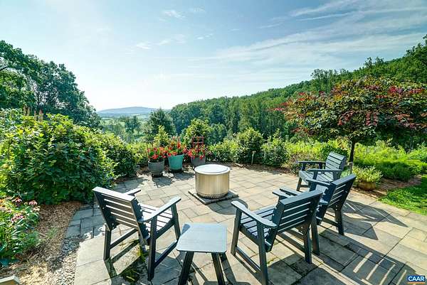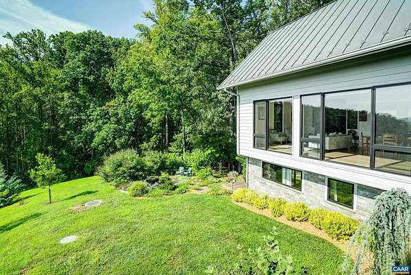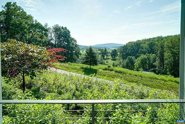One of a kind custom contemporary farmhouse by builder Peter Johnson on 22 acres in Bundoran Farm. Set within 2,300 acres of permanently protected land in North Garden. One of Central Virginia's premier conservation communities offers direct access to 15 miles of maintained trails, community lakes, working farmland, orchards, and Pippin Hill Vineyard. This home affords sweeping valley and Blue Ridge views from the great room, owner's suite, pergola deck & fire pit patio. The soaring great room features exposed wood trusses with steel connectors and a floor-to-ceiling linear gas fireplace. The contemporary kitchen includes a large island, quartz counters, professional gas range, custom maple cabinets, and porcelain backsplash. The main-level primary suite with an ensuite bath offers a freestanding soaking tub, quartzite vanity, and curbless steam shower. Two upstairs bedrooms share a full bathroom. Detached finished studio by Geo Barns is ideal as a home office or creative space. Native, drought-resistant perennial gardens, a screened porch, and a wrap-around covered/pergola deck for outdoor entertaining. Relax in the peaceful Zen garden with bubbling waterfall. Unfinished walkout lower level with HVAC plumbed for full bath.