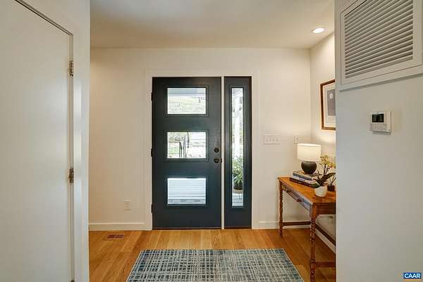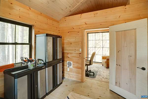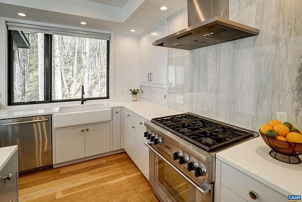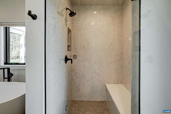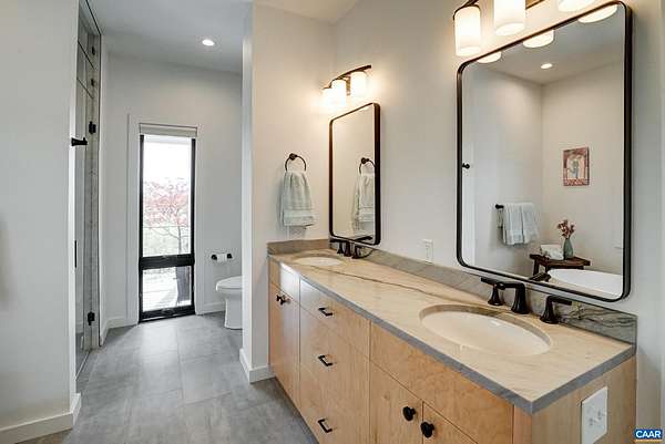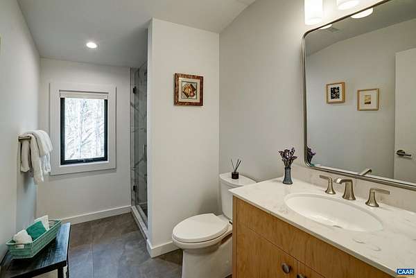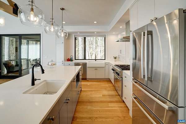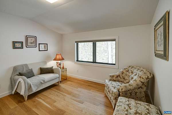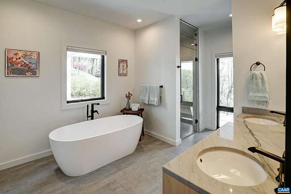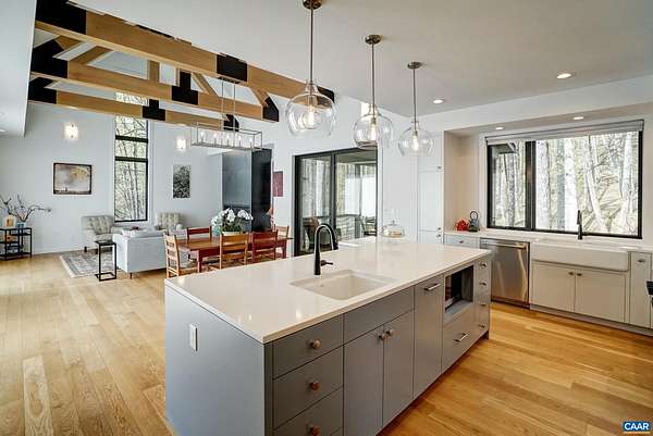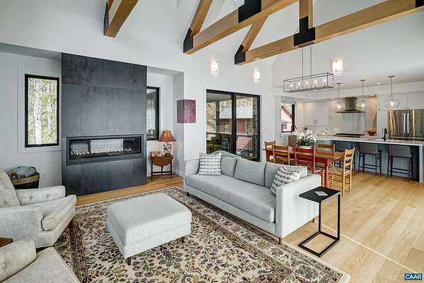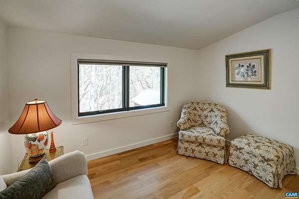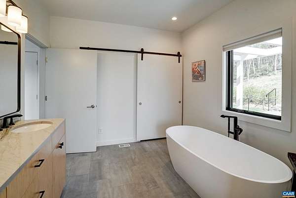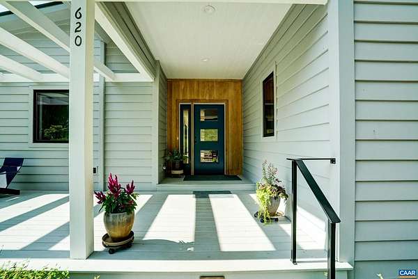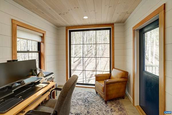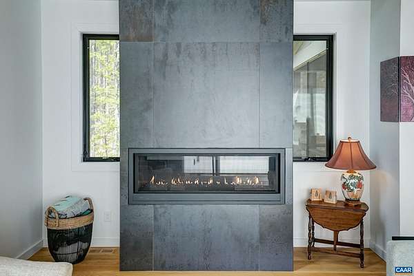 One of a kind custom contemporary farmhouse by builder Peter Johnson on 22 acres in Bundoran Farm. Set within 2,300 acres of permanently protected land in North Garden. One of Central Virginia's premier conservation communities offers direct access to 15 miles of maintained trails, community lakes, working farmland, orchards, and Pippin Hill Vineyard. This home affords sweeping valley and Blue Ridge views from the great room, owner's suite, pergola deck & fire pit patio. The soaring great room features exposed wood trusses with steel connectors and a floor-to-ceiling linear gas fireplace. The contemporary kitchen includes a large island, quartz counters, professional gas range, custom maple cabinets, and porcelain backsplash. The main-level primary suite with an ensuite bath offers a freestanding soaking tub, quartzite vanity, and curbless steam shower. Two upstairs bedrooms share a full bathroom. Detached finished studio by Geo Barns is ideal as a home office or creative space. Native, drought-resistant perennial gardens, a screened porch, and a wrap-around covered/pergola deck for outdoor entertaining. Relax in the peaceful Zen garden with bubbling waterfall. Unfinished walkout lower level with HVAC plumbed for full bath.