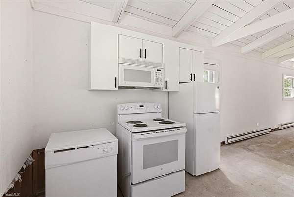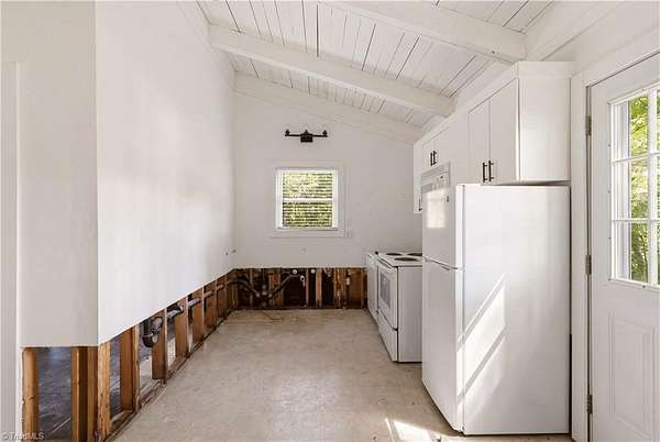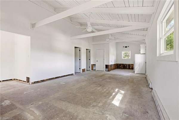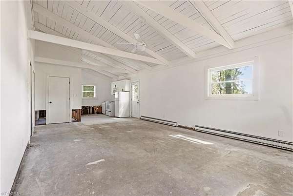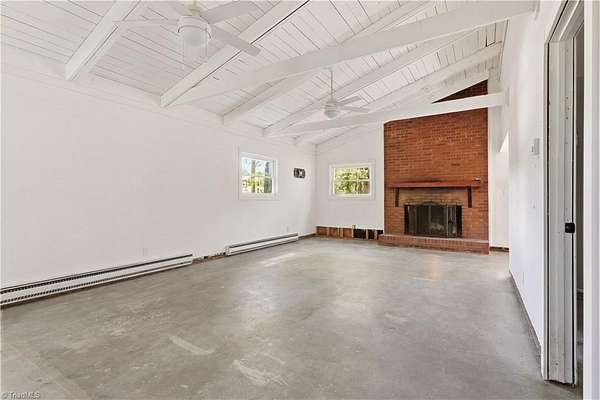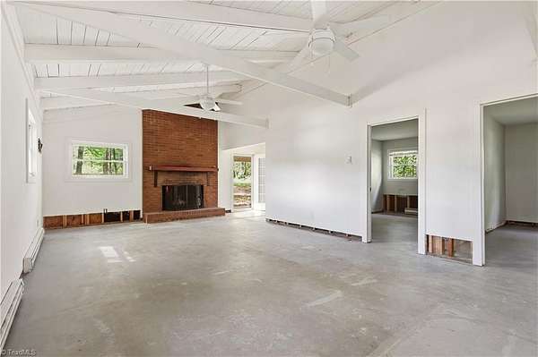 Opportunity meets potential on this rare 6.34 acre property in Clemmons, offering a beautiful landscape and endless possibilities. This cozy 2-bedroom, 1.5 bath cottage spans 1,080 square feet of character-filled living, featuring wood plank ceilings and a large wood-burning fireplace that creates a warm, inviting focal point. An additional office provides potential for a third bedroom. The home has undergone remediation following a prior plumbing issue, offering a fresh starting point for your updates and vision. A detached metal two-car garage with separate gravel driveway adds convenience and function. Whether you're looking to refresh the existing home, enjoy a peaceful getaway, or build your custom dream home, this property is all about the land and the opportunity it provides. Low county tax rate. Being sold AS-IS! See agent only notes.
