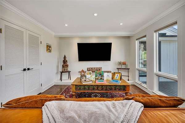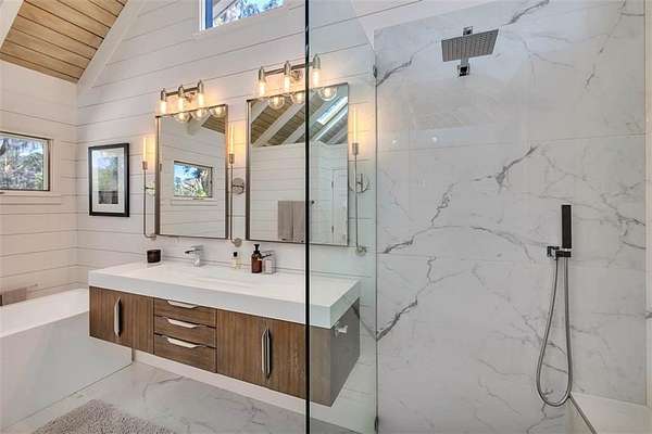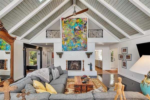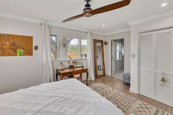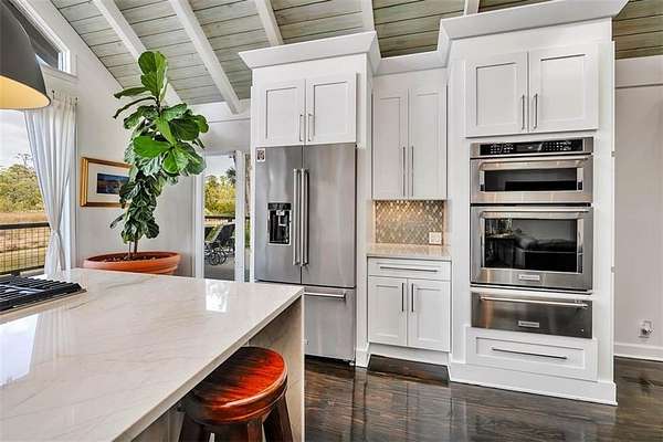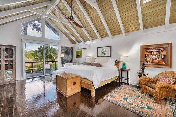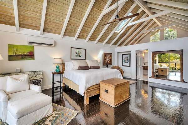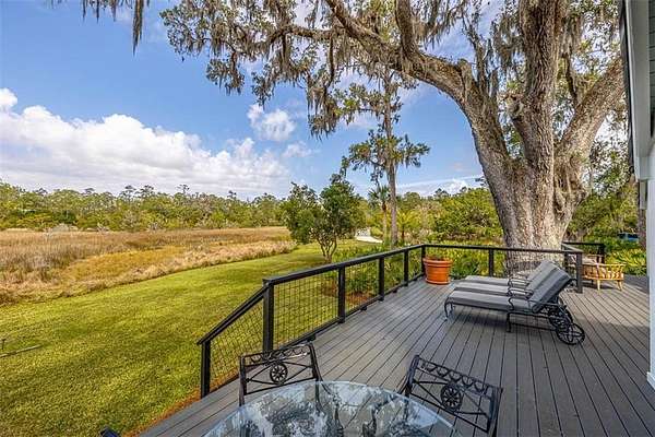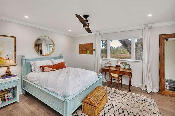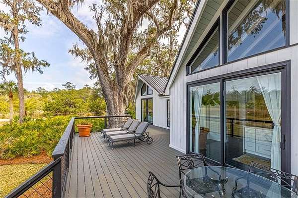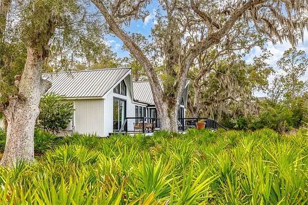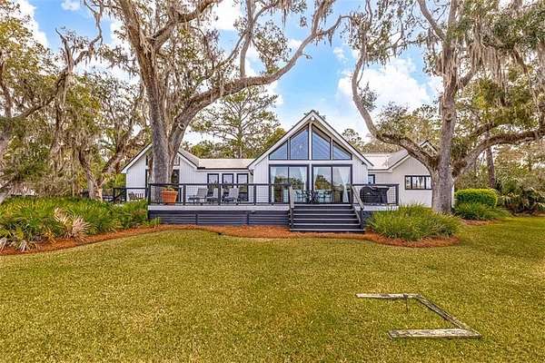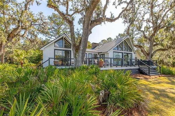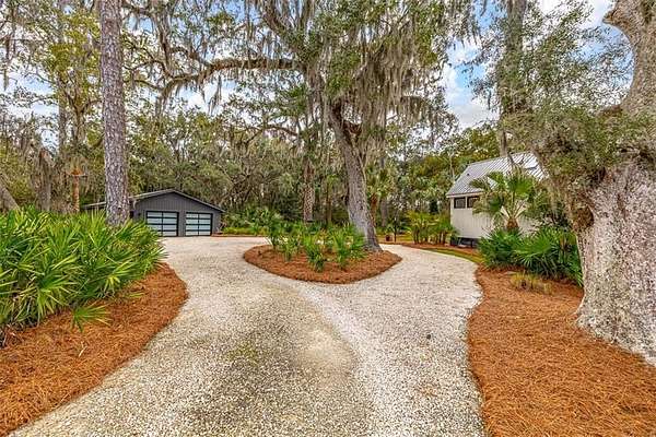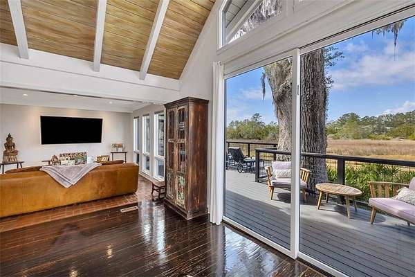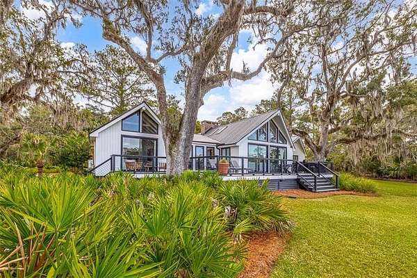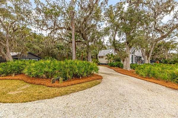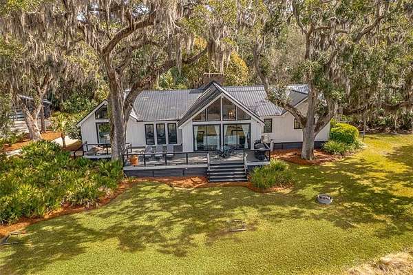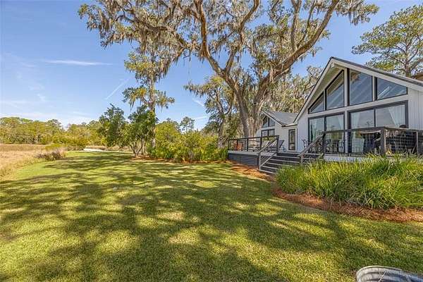 Nestled on a private 4.5-acre lot on St. Simons Island, this secluded retreat offers a rare and tranquil sanctuary with breathtaking marsh and nature views. A private entrance welcomes you across a bridge, guiding you down the long driveway to your own peaceful oasis. As you step inside, a charming brick foyer leads you into the spacious open living area, complete with a cozy wood-burning fireplace and a kitchen with soaring vaulted ceilings that add a sense of grandeur. The kitchen is an entertainer's dream, featuring stainless steel appliances, a warming drawer, and a large island with a propane cooktop, sink, and an eat-in breakfast bar. The space effortlessly flows outdoors to an expansive deck, ideal for enjoying the best of indoor/outdoor living. The main living areas and primary bedroom are adorned with refinished hardwood floors, adding warmth and character. The primary bedroom is a true retreat, featuring vaulted ceilings and a brick-floor sitting area that opens directly onto the large deck. The luxurious ensuite bath is complete with dual vanities, a separate tiled shower with dual shower heads, and a soaking tub, creating a spa-like experience. This home also offers two additional guest bedrooms, 2.5 baths, a formal dining room, and an oversized laundry room. The enormous loft area provides endless possibilities, whether as a fourth bedroom, office, or bonus room. With ample parking options, including a two-car detached garage with extra storage and an additional carport, this home is equipped to meet all your needs including boat and RV parking. Featuring a durable metal roof and three mini-split systems for efficient climate control, this property truly has it all. NO HOA and plenty of room for a hobby farm and pool!!!!