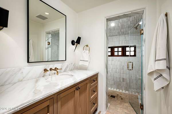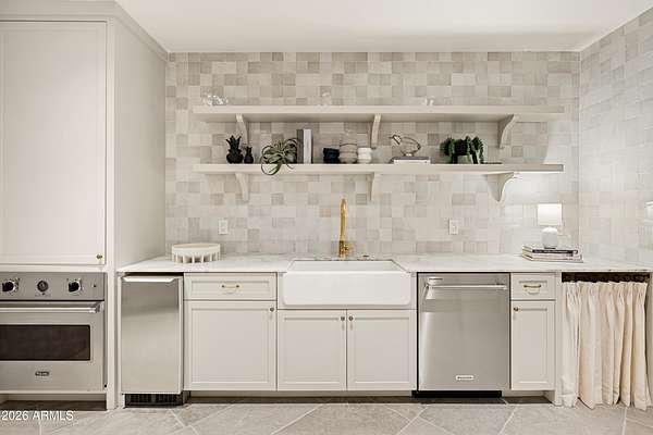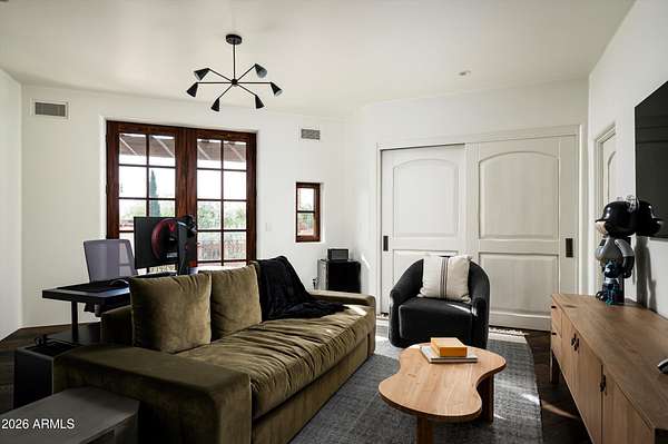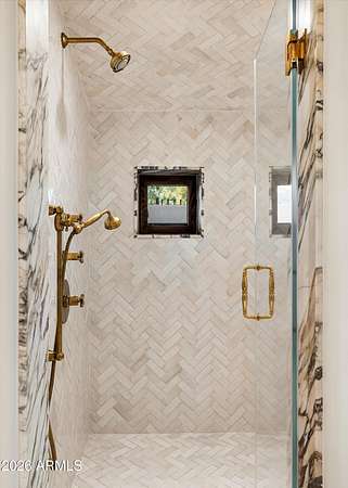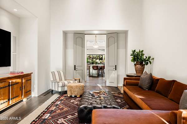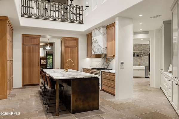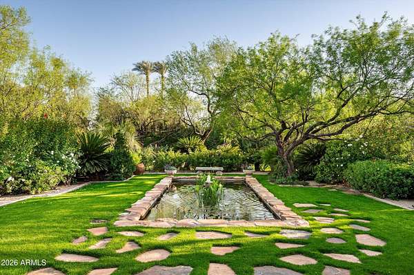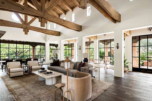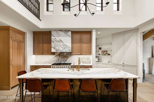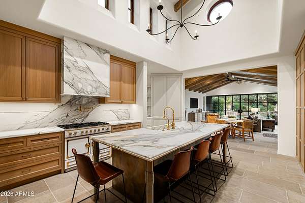Fully remodeled and masterfully reimagined with interiors by the renowned firm Nate Berkus Associates, this more than 7,000-square-foot residence blends timeless European elegance, impeccable craftsmanship, and curated luxury. Set on expansive private grounds, the estate offers a rare opportunity to experience resort-style living in a home of extraordinary design and refined sophistication. Soaring ceilings and walls of glass fill the home with natural light, highlighting its grand scale and refined architectural detailing. Rich wood and limestone flooring create warmth and continuity throughout, while six hand-carved limestone fireplaces anchor the living spaces and reclaimed wood accents add depth and timeless character. The thoughtfully designed floor plan features four expansive en-suite bedrooms and four-and-a-half baths, each appointed with bespoke materials and elevated finishes. The private primary wing serves as a true sanctuary with two separate primary bathrooms, two generous custom closets, and a secluded courtyard with a private outdoor shower for a tranquil outdoor escape. At the heart of the home, the kitchen pairs beauty and performance. Custom cabinetry, slab marble surfaces, and a dramatic marble-and-bronze island form an architectural centerpiece, complemented by Sub-Zero refrigeration and a statement La Cornue range. A fully equipped secondary kitchen adds exceptional convenience for entertaining or daily living. The fully enclosed grounds evoke the feel of a private resort, with lush gardens, mature roses, vibrant blooms, and citrus trees, alongside a tranquil koi pond and wood-fired pizza oven. Multiple covered entertaining areas, artificial turf, and a dedicated greenhouse enhance both charm and versatility, while the infinity-edge pool, framed by limestone decking and a picturesque pergola, creates an idyllic setting for relaxation and entertaining. Two garages with space for 4.5 cars complete the offering. Located within walking distance of the iconic Arizona Biltmore, this exceptional estate offers a rare blend of privacy, scale, and resort-inspired living.