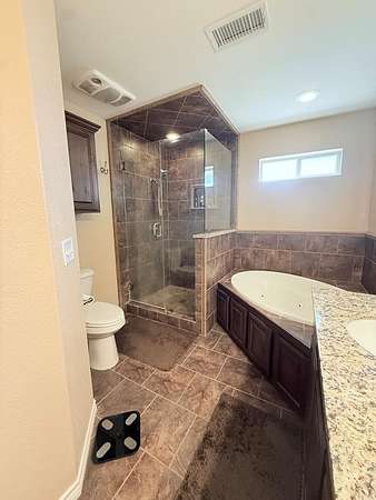 - Carpeting, Ceiling Fan(s), High Ceilings, Jetted Tub, Shades/Blinds, Solar-Owned, Tile Flooring