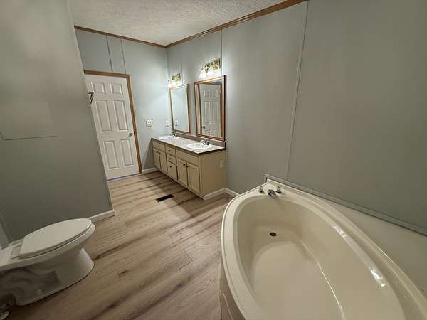The oversized primary suite offers ample closet space and a large en-suite bath with a soaking tub and separate shower. Recent upgrades include a brand-new HVAC system, engineered hardwood flooring throughout, updated light fixtures, fresh interior paint, a new concrete front patio with walkway, and a large rear deck perfect for entertaining. A newly installed septic system adds peace of mind.