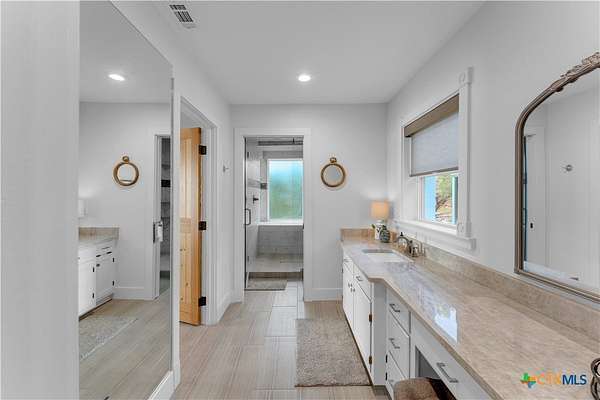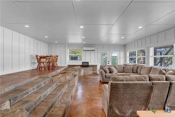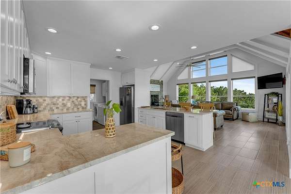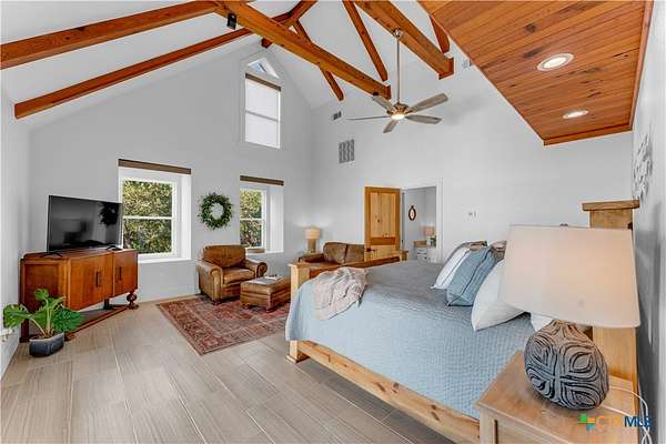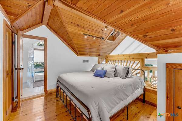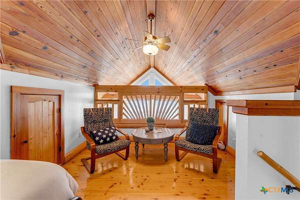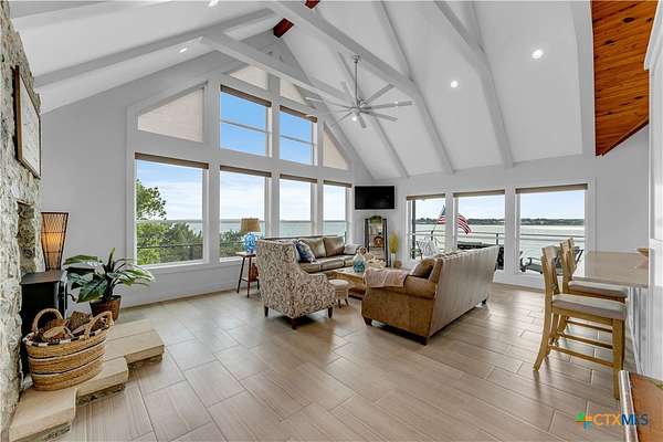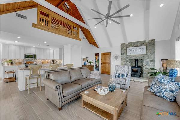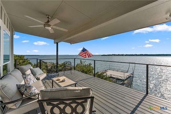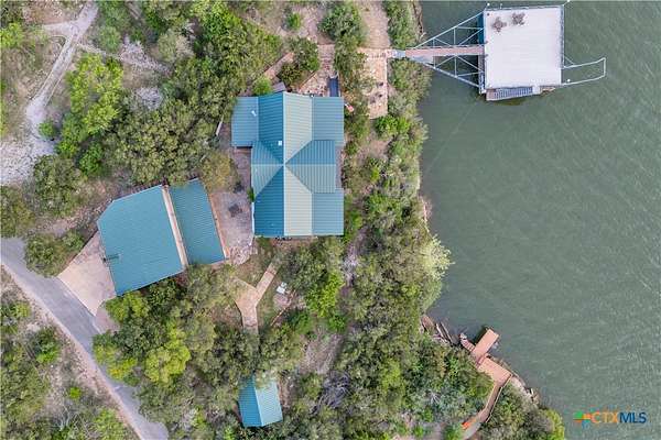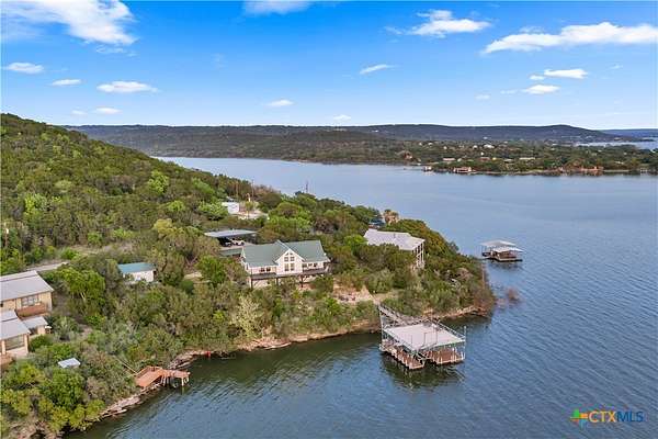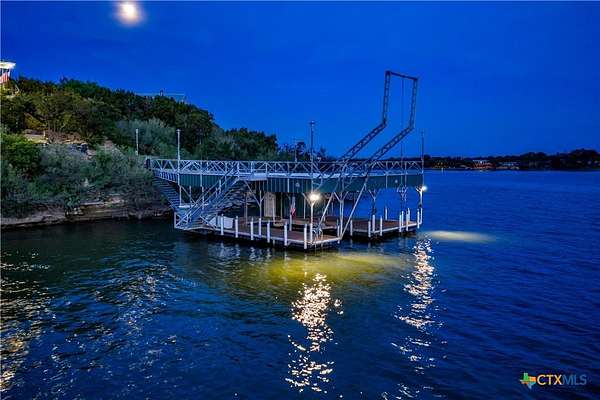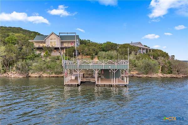 Experience the ultimate lakeside retreat on the eastern shores of Lake Buchanan, created for those who appreciate both serenity and outdoor adventure, this remarkable waterfront estate provides deep water access and some of the most desirable fishing. This beautifully appointed home is filled with natural light and sweeping lake views, showcasing expansive windows throughout, each fitted with Legacy blinds, several of which are remote controlled for added convenience. The primary suite offers a peaceful escape, highlighted by a luxurious walk-in shower with lighting and a custom music system for a spa inspired experience. A private guest suite is tucked into the loft, while a spacious bunkroom, also ideal as an additional lounge area, includes a full bath and comfortable seating space. A large game room creates the perfect environment for leisure and hosting. At the center of the home, elegant Taj Mahal marble countertops enhance the kitchen and main living areas, leaving a lasting impression. The property also features a detached one bedroom guest cottage complete with a full bath and kitchenette, providing added privacy and comfort for visitors. The outdoor kitchen and patio set the stage for grilling and dining under the open sky, while evenings can be spent gathered around the fire pit enjoying s'mores and meaningful moments beneath the stars. A standout feature is the custom engineered two story boat dock, designed with a specialized cable system that allows for smooth adjustment to changing water levels. Built with both strength and ease of use in mind, the dock includes two boat slips with lifts for secure and convenient lake access. A dedicated storage room keeps equipment organized, while on site rod holders and a fish cleaning station, equipped with electricity and a water pump, cater to fishing enthusiasts. This exceptional waterfront feature blends durability, thoughtful design, and practicality for an elevated lakefront lifestyle.