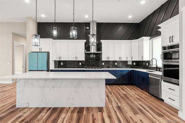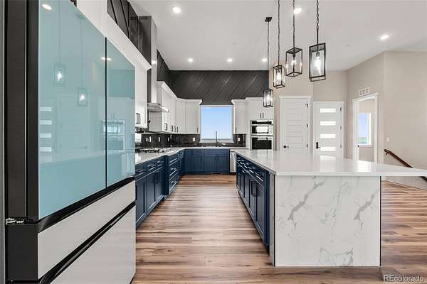 Step inside and experience 12-foot ceilings that open the main level, expansive windows capturing endless horizon views, and a flowing layout that balances sophistication with everyday livability. The heart of the home is the designer kitchen — featuring a massive waterfall quartz island, premium cabinetry in a two-tone palette, floor-to-ceiling luxury backsplash tile, gas cooktop, double ovens, and statement pendant lighting that completes the space with modern character.