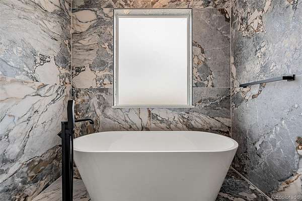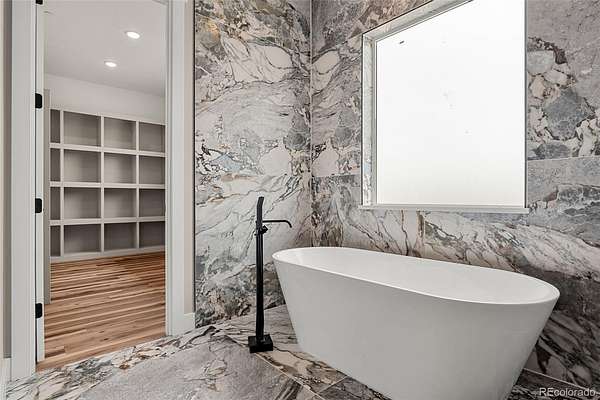 The great room centers around a custom floor-to-ceiling luxury tile fireplace with built-in shelving, creating a bold architectural focal point perfect for both relaxation and entertaining. The primary suite offers a true spa experience with full slab floor-to-ceiling marble-look tile, freestanding soaking tub, an oversized custom shower, and a walk-in closet designed with function and style.