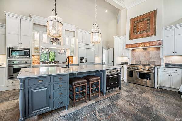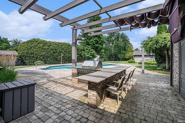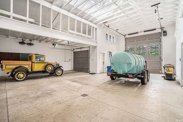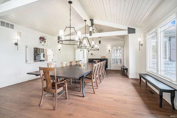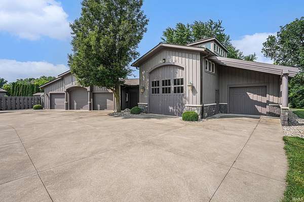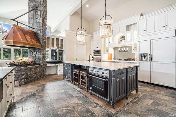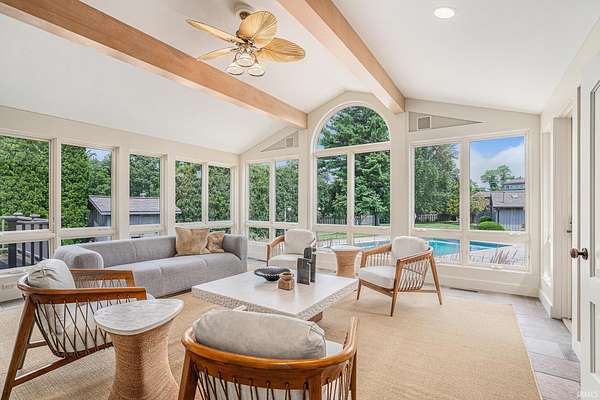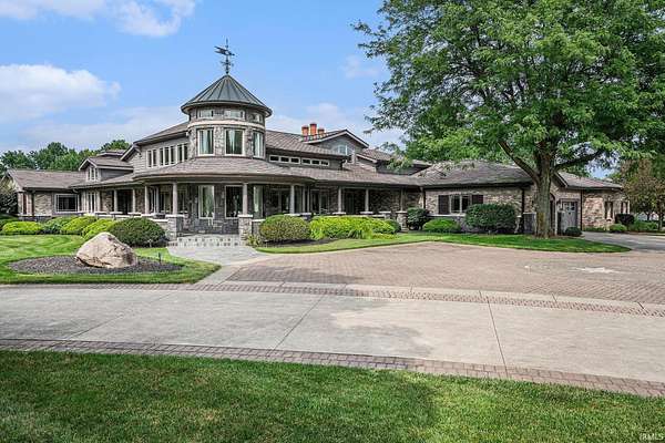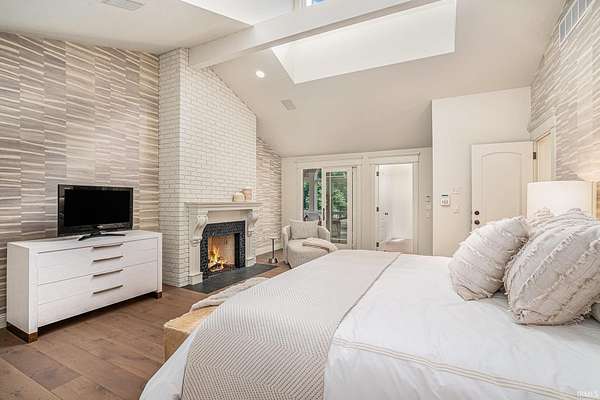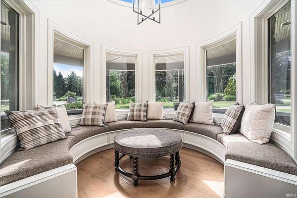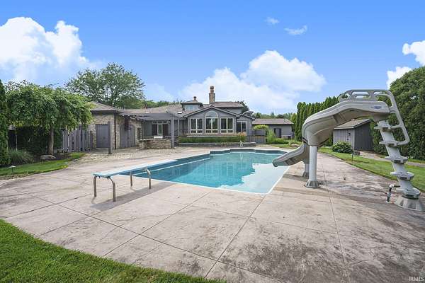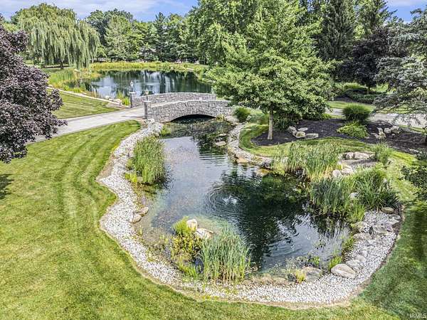 Open House Scheduled for August 23 1-3pm! A stone bridge and layered landscaping set the tone for this private 5.8-acre estate near downtown Middlebury. Inside, the home has been modernized--redesigned and furnished for a part-time retreat, though fully equipped for year-round living. Vaulted ceilings, high windows, and lit beams draw light into the open-concept living area and kitchen, where original tile and hardware meet new hardwood flooring, Ayr cabinetry, and a statement three-sided gas fireplace. The dining room and hearth offer an interlude between the main spaces with a natural extension to the sunroom and patios. Every light, rug, seat, book, throw, and furnishing has been carefully chosen and is included in the sale--making this home ready to be lived in. The primary suite features its own fireplace, skylights, soaking tub, and walk-in shower. On the other side of the home are additional bedrooms and a sitting room. Downstairs, you'll find a tiered theater room and kitchenette, two half baths, and an open versatile space, all fit for hosting large groups. Outside, enjoy the pool and outdoor kitchen, and a hillside firepit overlooking the Little Elkhart River. In total, the home has 5 bedrooms, 4 full and 4 half baths, two laundry areas, and a 5-car garage. A detached garage offers four stalls, one RV stall, and RV hookups. The home has two heating sources: gas forced air and geothermal via pond. From high ceilings to rolling grounds, this property reflects extravagant living and well-kept spaces--the perfect backdrop for your next chapter.