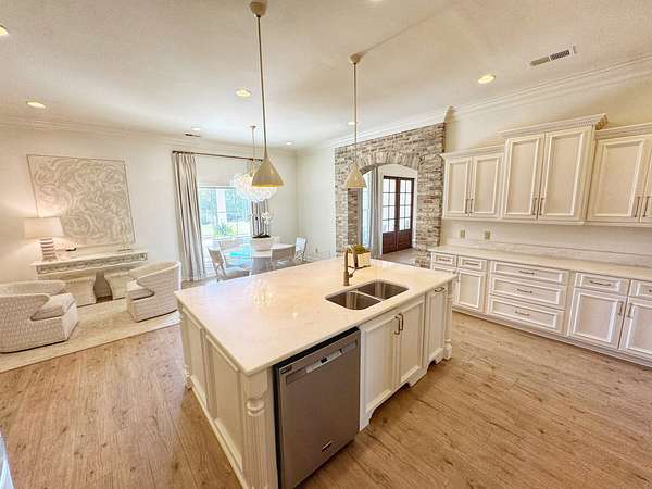 Kitchen featuring custom cabinetry, marble countertops, large island, stainless appliances, double oven, and brick-arched cooktop surround