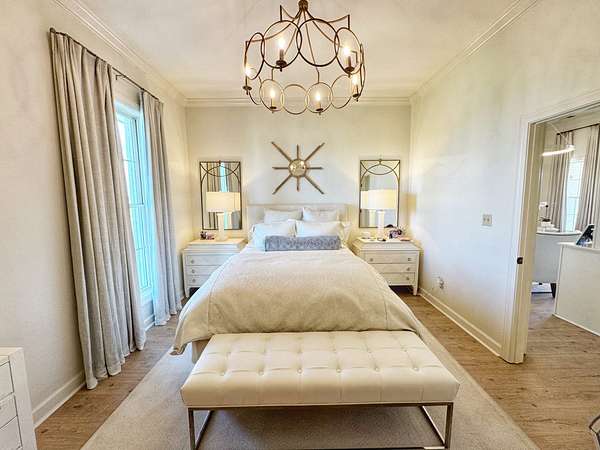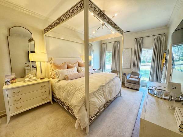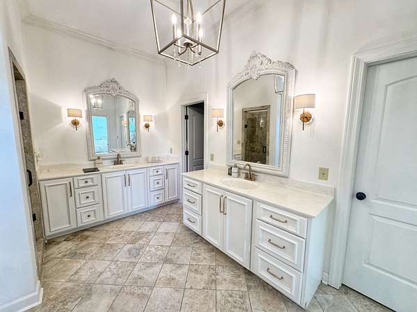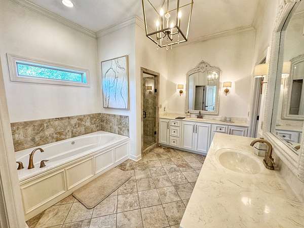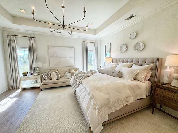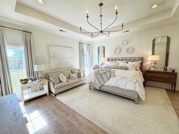 Master Suite with tray ceiling, sitting area, and a luxurious bath featuring a jetted tub, walk-in shower, his-and-hers vanities, and dual walk-in closets
