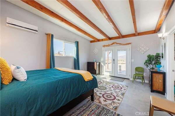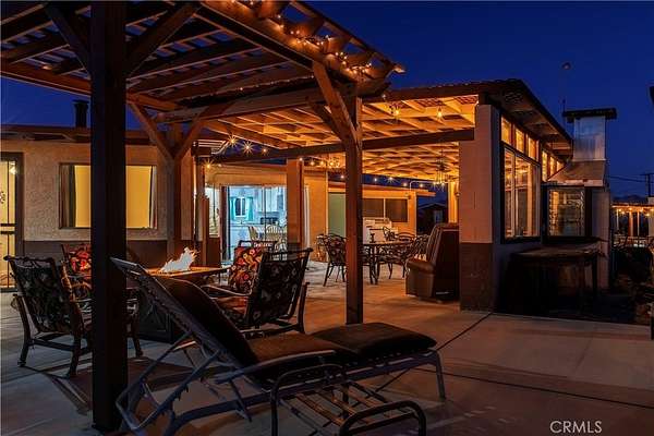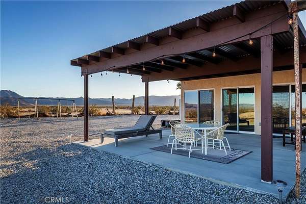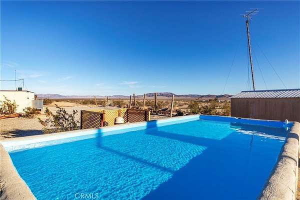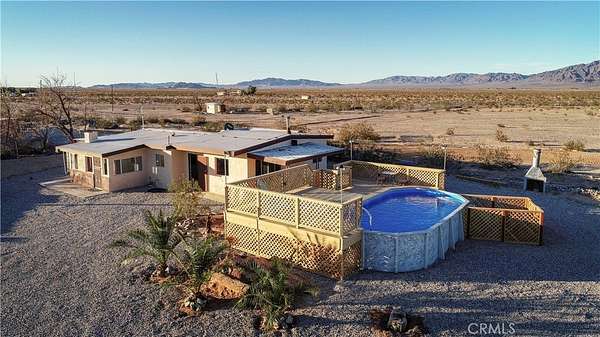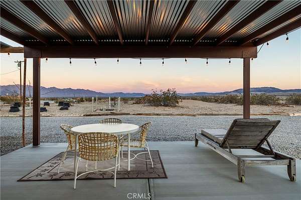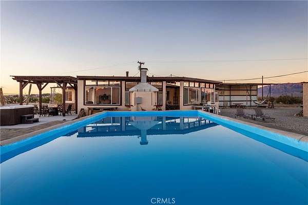 Escape to a secluded 20-acre corporate retreat compound designed for privacy and serenity. This exceptional property boasts three homes and 4 APNs, a tranquil yoga room, and two inviting pools, creating the perfect setting for both relaxation and recreation. The central building features a sunlit yoga studio with sliding glass doors that open to stunning views of the expansive desert landscape. A bright kitchen, complete with a dining table, lounge chairs, and sliding glass doors, offers an ideal space for meals or quiet moments with tea. The main house includes an open bedroom, two bathrooms with showers, a covered patio lounge, and two outdoor showers. Step outside to a shaded patio that leads to a pool and deck, where you can unwind while taking in the vast desert scenery. An exterior shaded area features a private outdoor bathroom equipped with a sink, shower, and toilet.