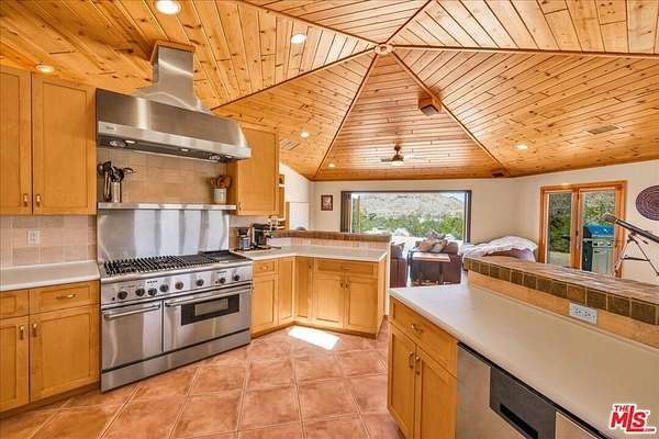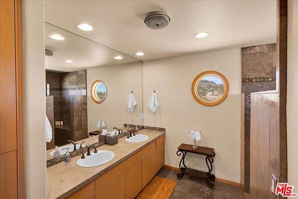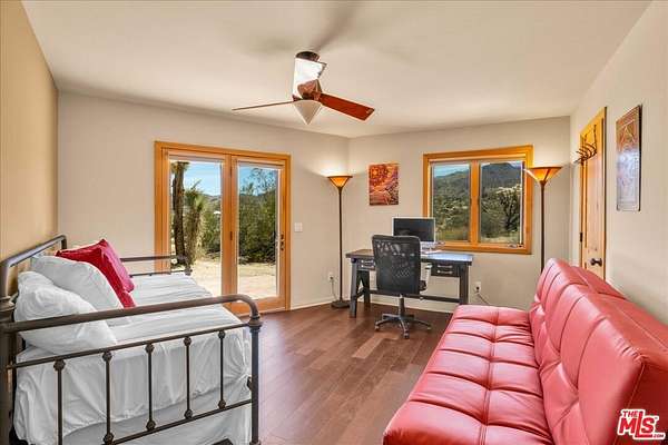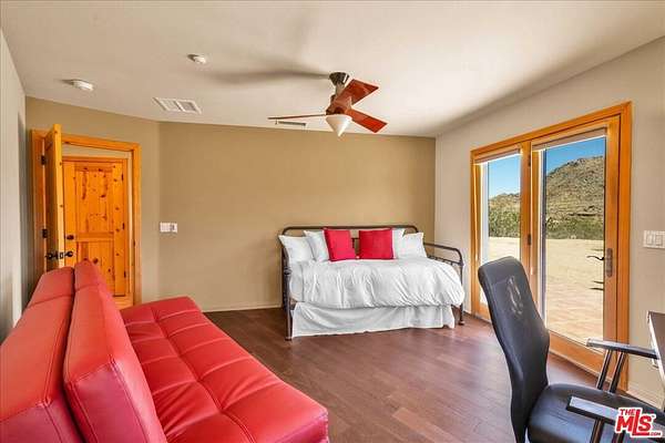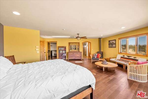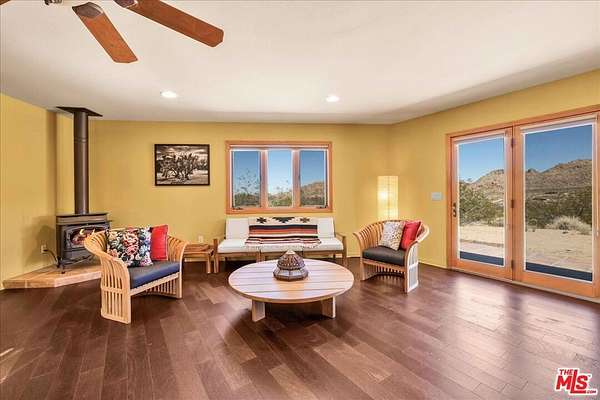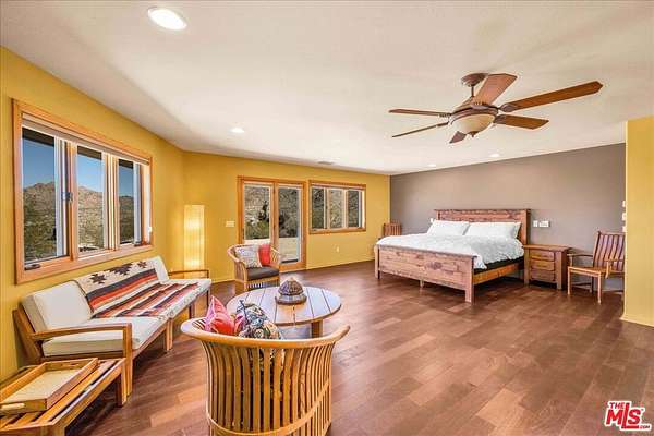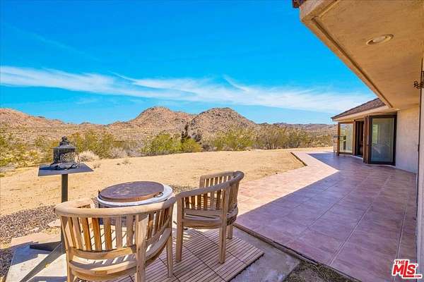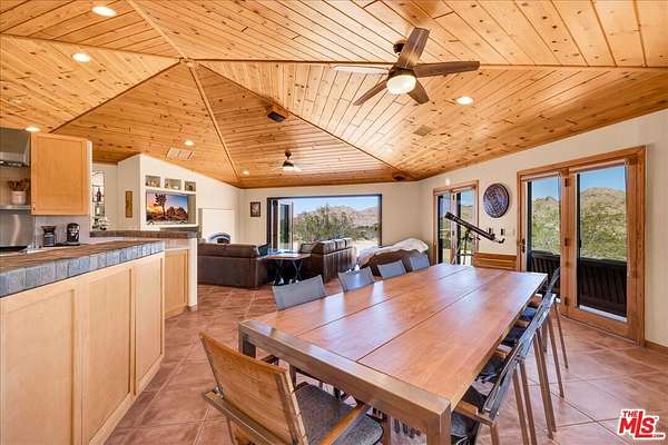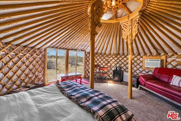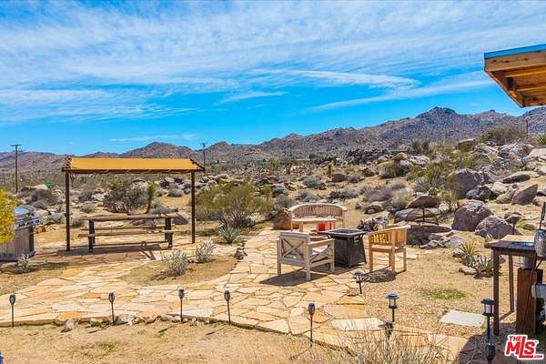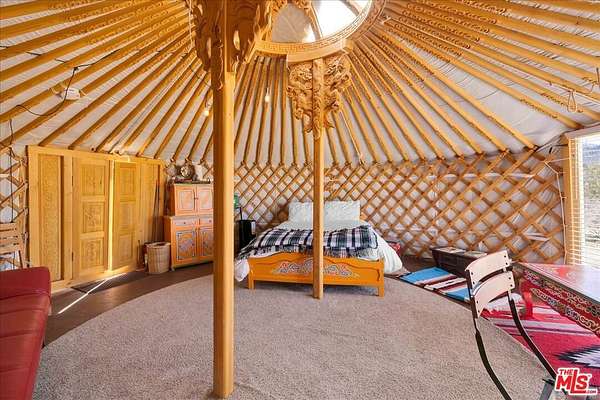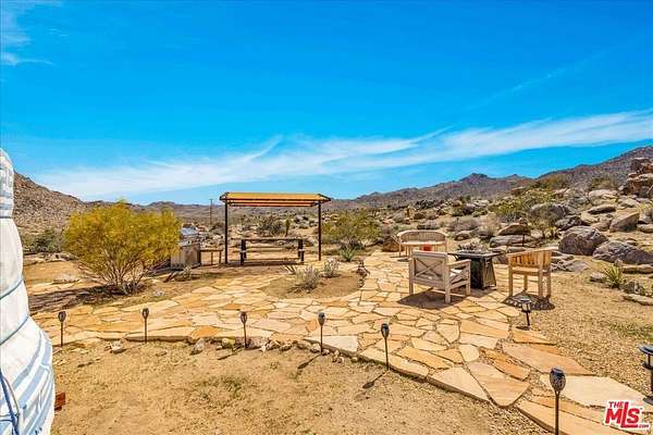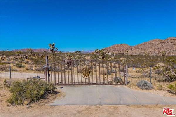Desert Sanctuary: 16-Acre Private Estate in Joshua Tree. Nestled midway between Joshua Tree town and the west entrance to the National Park lies a rare offering: 16 fully-fenced acres of pristine desert landscape with complete privacy. The thoughtfully positioned 2,733 sq ft residence sits at the heart of the property, providing uninterrupted 360 views of the surrounding wilderness. The main house features 3 bedrooms and 2 baths, with the central living space defined by a striking hexagonal ceiling that draws natural light through strategically placed windows and skylights. A dramatic doorway opens directly to the landscape, blurring the boundary between interior comfort and desert beauty. The property offers practical amenities that enhance both work and leisure: a 4-car attached garage, additional detached storage, paid solar panels, and reliable connectivity via a private microwave internet tower and Starlink service. For guests or retreat space, an authentic hand-carved Mongolian yurt provides a luxurious glamping experience, complete with electricity, climate control, and custom furnishings. The outdoor living area includes a private bathroom with heated toilet seat, outdoor shower under the sky, and a cedar hot tub for stargazing. The landscape showcases more than100 Joshua trees among the Mojave's iconic flora - sculptural boulders and native plants create natural privacy, while providing habitat for desert wildlife. Residents regularly spot roadrunners, desert tortoises, coyotes, and soaring hawks across the property. This sanctuary offers the perfect balance: proximity to Joshua Tree National Park's wonders, yet secluded enough to provide true tranquility and connection with the desert's timeless beauty.