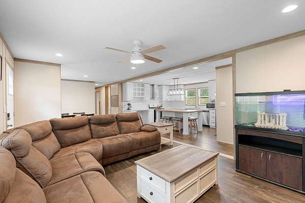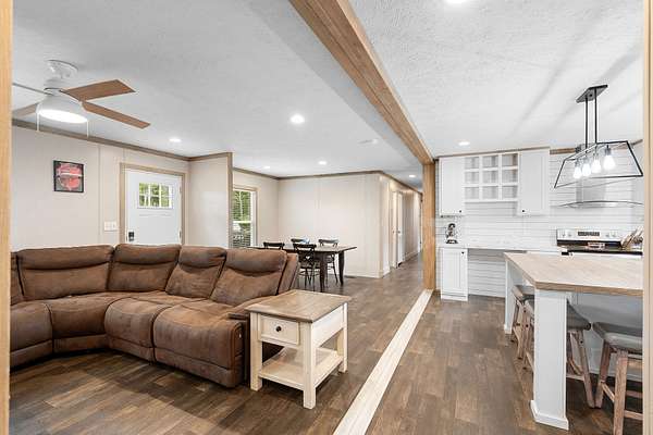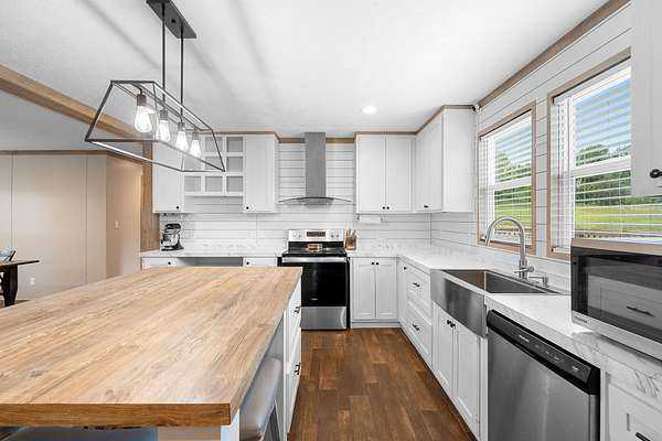 The spacious 5-bedroom, 2-bath home features an open-concept layout with modern farmhouse finishes throughout. The kitchen includes white cabinetry, a large wooden island, stainless steel appliances, a farmhouse sink, and a sliding barn door pantry. The living space is bright and airy with modern lighting, ceiling fans, and an inviting layout that's perfect for gatherings.