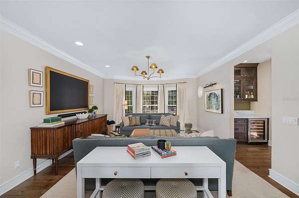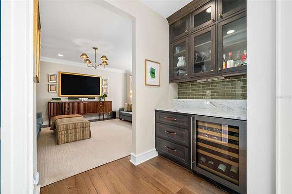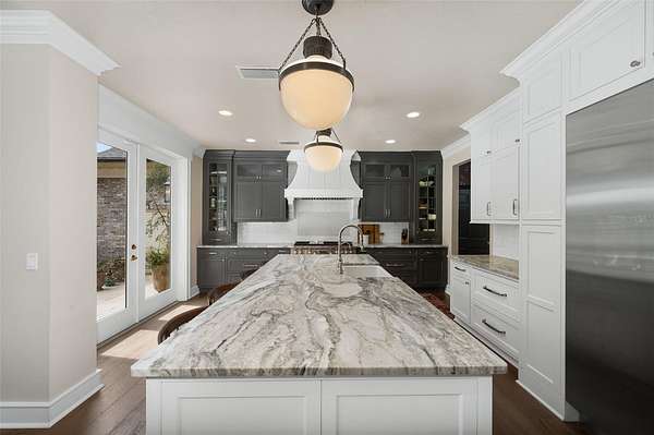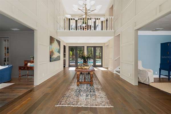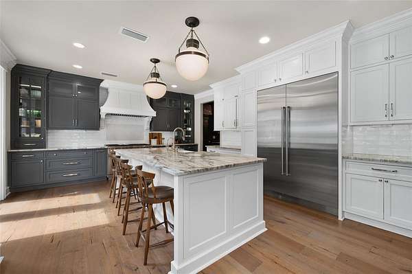 Inside, gorgeous hardwood floors unify the entire home while a dramatic two-story foyer with intricate woodwork welcomes guests and frames immediate views through French doors to the pool and completely private backyard. The first floor offers multiple gathering spaces, including a sitting room with fireplace, formal dining room that flows through a Butler's Pantry to the kitchen and a spacious family room with a nearby half bath and wine bar—ideal for entertaining.