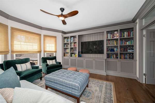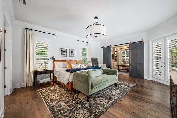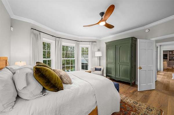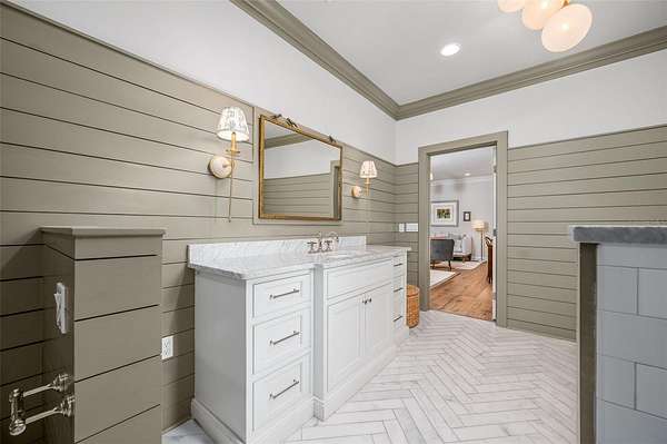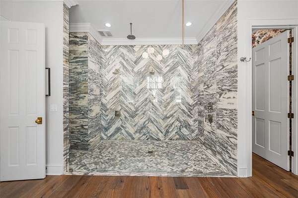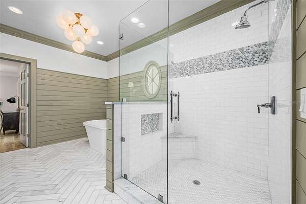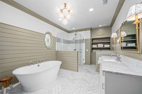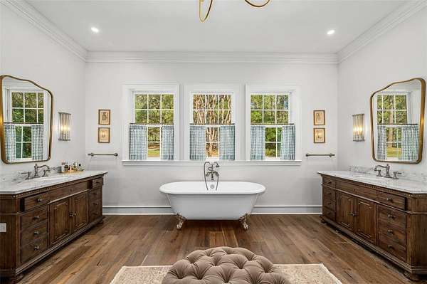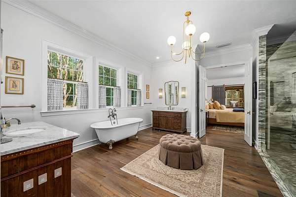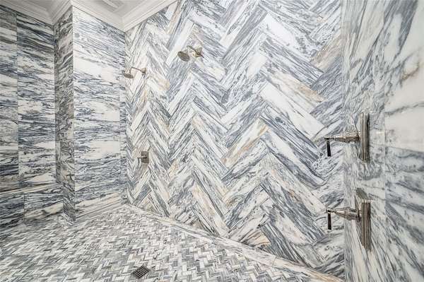 The luxurious primary wing serves as a private retreat, featuring a sitting room (or office), a spa-inspired bath with a free standing tub, separate marble vanities, and a large walk-in shower finished in Calacatta marble with rain shower head and multiple shower heads. A large dressing room with an extensive organizational closet system completes the suite.