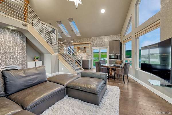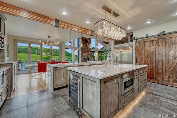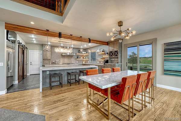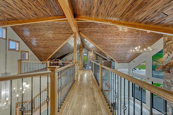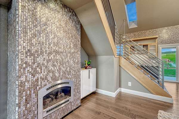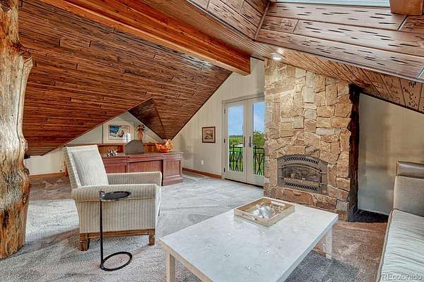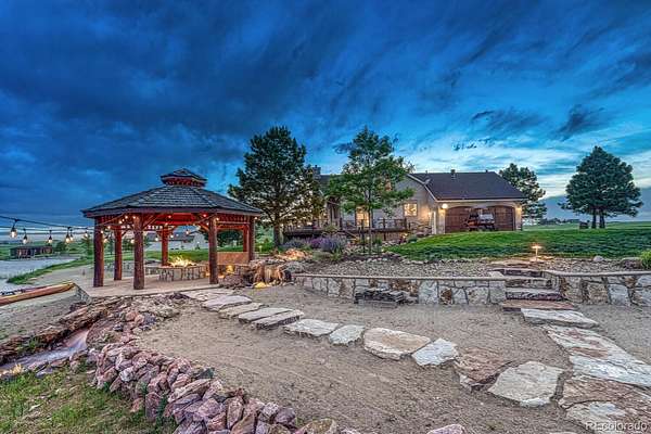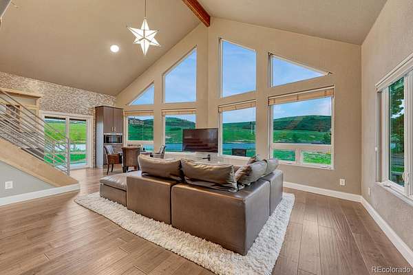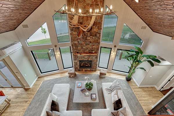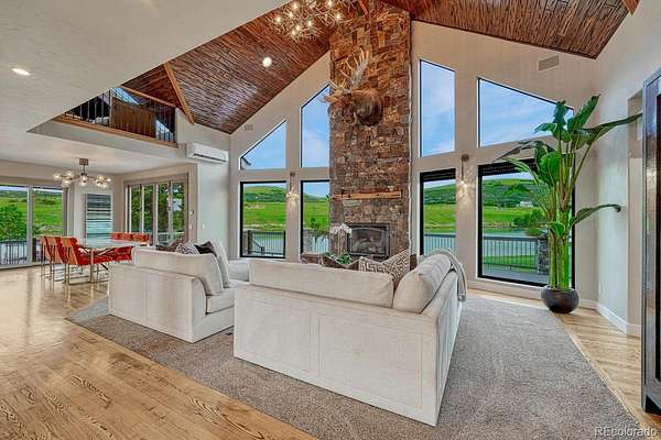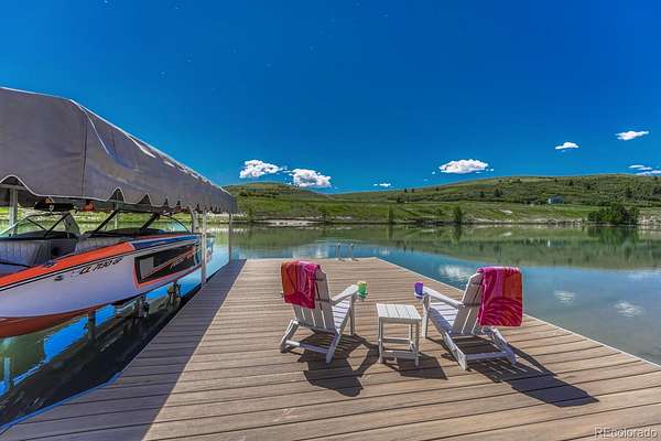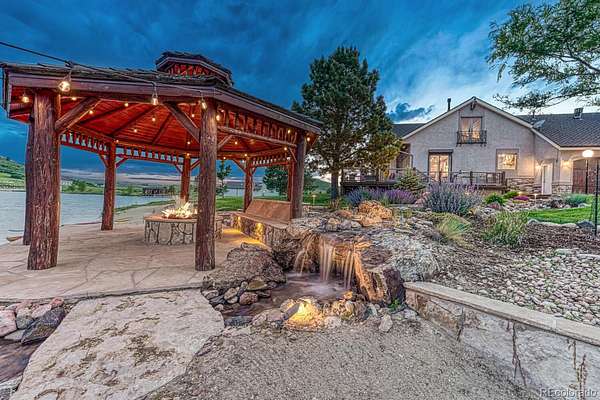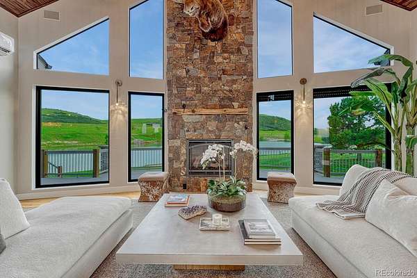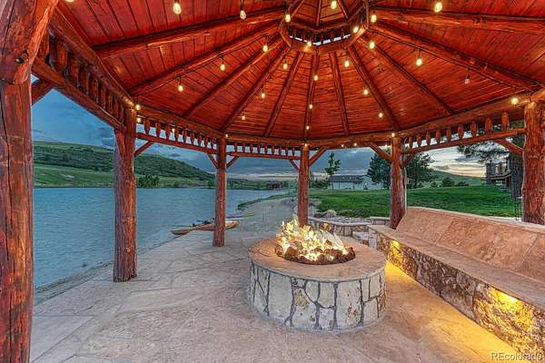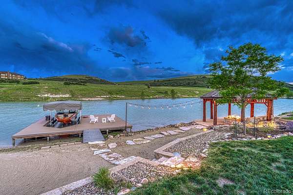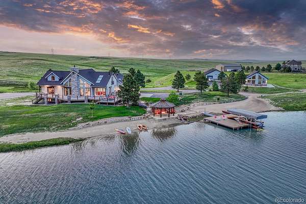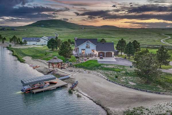 Welcome to The Estates at Living Waters, an extraordinary gated community in the heart of Larkspur, conveniently located between Castle Rock and Colorado Springs yet miles away from it all! Enjoy luxury lakefront living in this exclusive covenant-protected community centered around a private 12-acre recreational lake. With only 12 estate lots averaging 35 acres, the property offers exceptional privacy, scenic surroundings, and year-round recreation. This fully renovated custom two-story home features 4 bedrooms, 5 bathrooms, and 3 fireplaces, designed to capture stunning lake views and seamless indoor-outdoor living. The primary suite offers expansive views, a five-piece spa bath, and a spectacular walk-in closet. The finished basement includes a home theater, game room and wet bar for added entertainment space. Approximately 800 feet of private shoreline borders the trout-stocked lake, allowing waterskiing, wakeboarding, kayaking, and fishing in summer, plus ice skating and ice fishing in winter. A separate 1,164 sq. ft. guest house includes one bedroom plus a loft, one full bathroom, a full kitchen, and a lakefront deck—ideal for guests or extended family. Outdoor amenities include a sandy beach, private boat dock with lift and cover, gazebo with gas lava rock fire pit, pond with stream and waterfalls, and a large built-in hot tub with Covana cover. The front courtyard features an enclosed recreation area for year round enjoyment. The property also includes a heated 1,800 sq. ft. toy/RV garage with five garage doors, epoxy flooring, and a bathroom. An HOA-approved barn may be constructed if desired. Horses are welcome and the property offers direct access to miles of trails. Bordering Douglas County Open Space and the Lincoln Mountain Trailhead, residents enjoy direct access to hiking, biking, and horseback riding trails with abundant wildlife. A rare opportunity to own a premier Colorado lakefront estate combining privacy, recreation, and resort-style living.