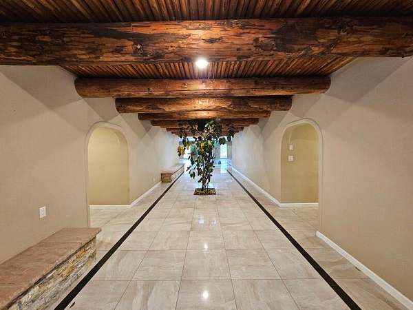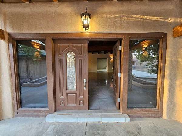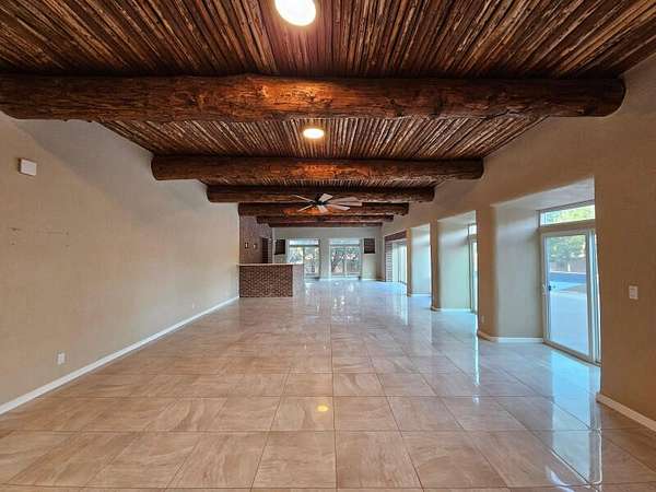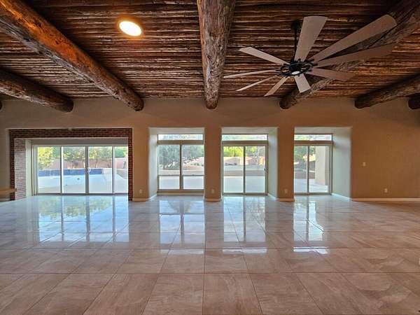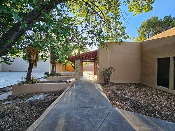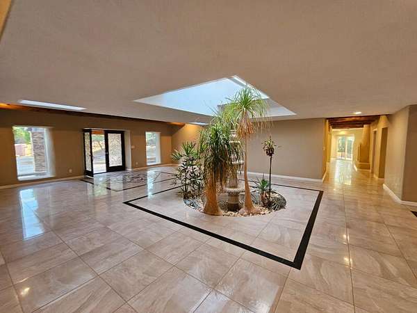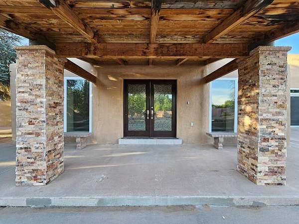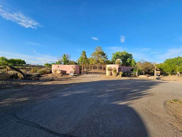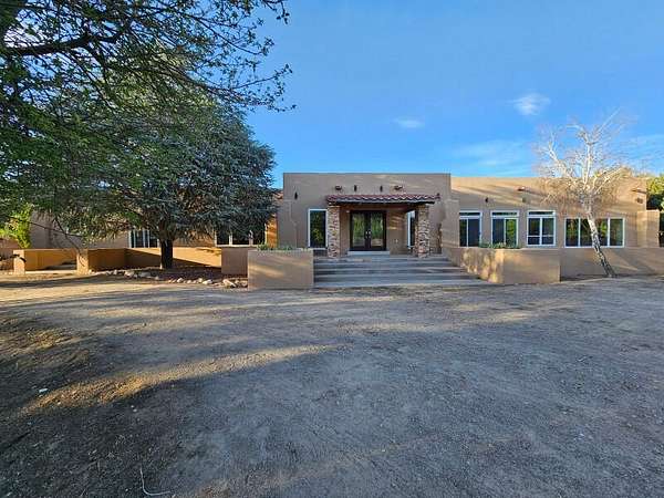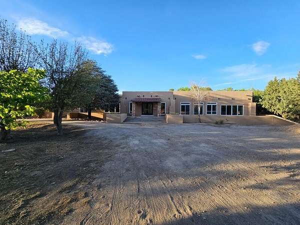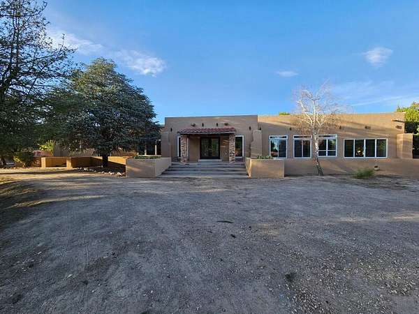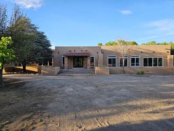 Located behind secured gates on 2.51 acres, this contemporary property offers privacy and close proximity to the Corrales Bosque and the Rio Grande River. The entry atrium includes an indoor garden and a large skylight providing natural light to the space. The main living area features a built-in bar and a wood-beamed ceiling crafted with beautiful custom detail. The kitchen includes custom cabinetry and countertops, a commercial-grade range, oversized pantry island with seating area and additional modern finishes. The owner's suite includes a fireplace and a bathroom with dual sinks a freestanding tub integrated with the shower area, and an amazing walk-in closet. Detached casita with 2 bedrooms and 2 bathrooms and not to mention a pool - (pool needs work). This home is a must see!