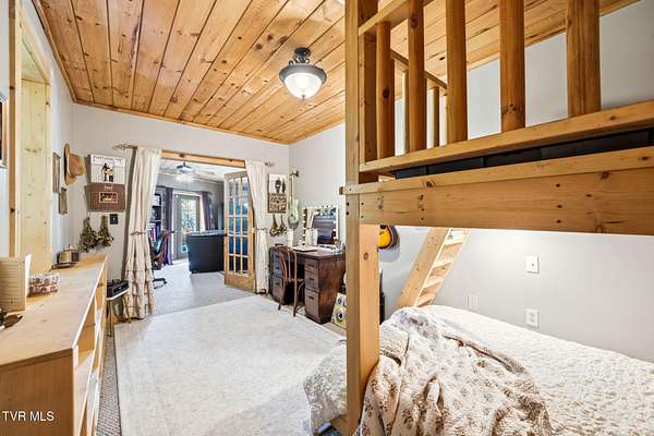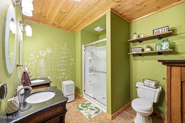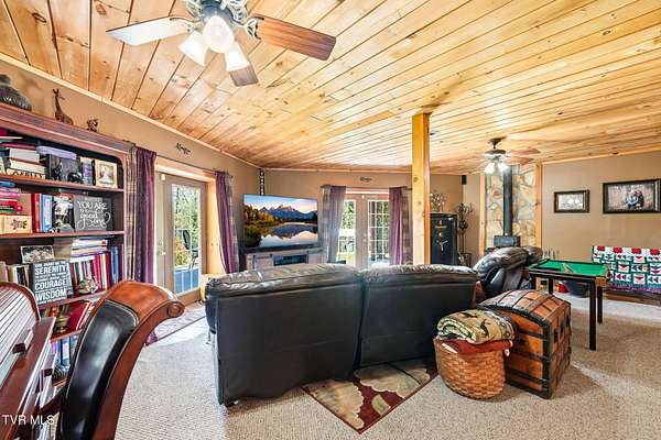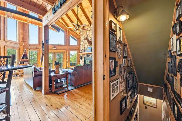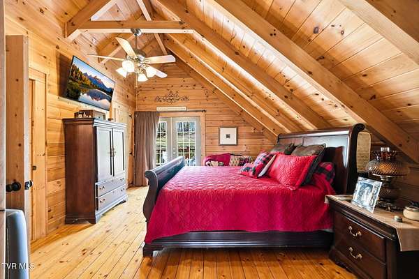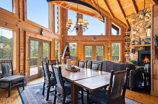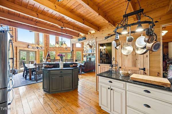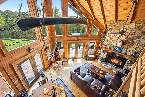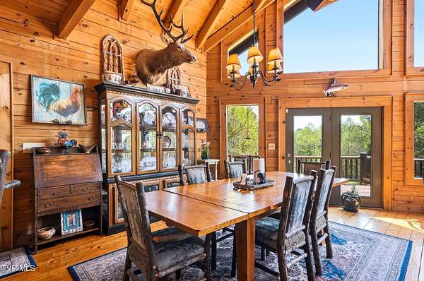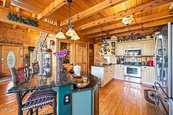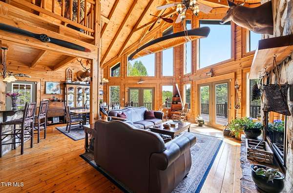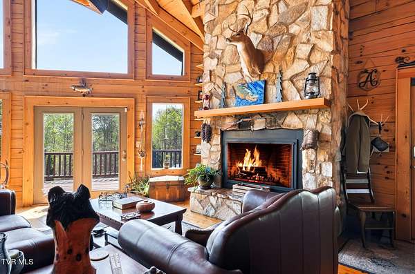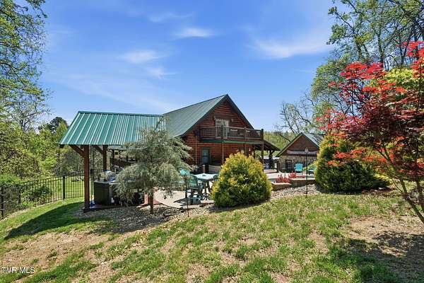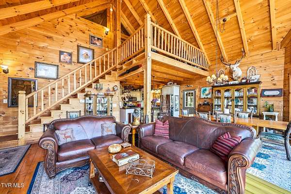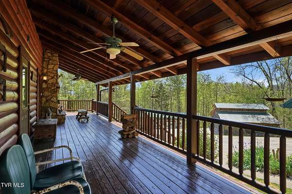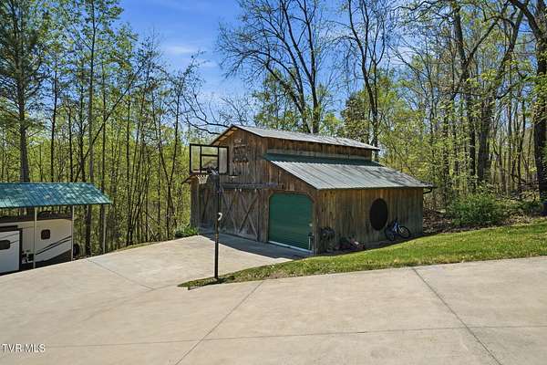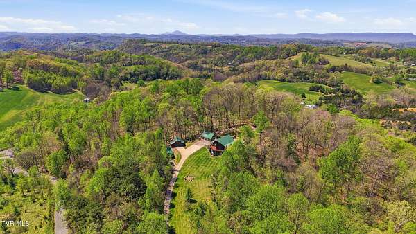 Welcome to your private mountain retreat! This stunning custom built log home offers 2,762 square feet of rustic charm and modern comfort, perfectly situated on 17.6 acres of serene, picturesque land with peekaboo mountain views. From the moment you arrive, you will be captivated by the craftsmanship and natural beauty that surrounds you. Inside, the home features spacious living areas with warm wood finishes, a beautiful stone fireplace, and a well appointed kitchen complete with granite countertops, perfect for both everyday living and entertaining. The bathrooms are thoughtfully designed, including a beautifully crafted tile shower, with one featuring relaxing whirlpool jets for a spa like experience. Step outside to enjoy the peaceful setting from the expansive wrap around porch or unwind by the outdoor stone fireplace. Designed for both relaxation and functionality, the property includes a sparkling heated pool with an outdoor cooking area, perfect for hosting gatherings, as well as a hot tub that conveys with the property for year round enjoyment. The barn features 2 concrete bays and a wooden floor on the left walk in door, water, and power, making it ideal for equipment, or hobbies, and the detached three car garage includes an attic above for additional storage. A concrete driveway provides easy access to the home, and the dedicated RV landing area with electrical hookups adds extra convenience for guests or travel enthusiasts. Centrally located in the Tri Cities, this property is approximately 25 minutes from Johnson City, Bristol, and Kingsport, and only 8 minutes from the Tri Cities Airport, offering both privacy and convenience. Whether you are looking for a full time residence, a weekend getaway, or a place to entertain, this one of a kind property offers it all. Experience the perfect blend of privacy, comfort, and outdoor living. This is more than a home, it is a lifestyle