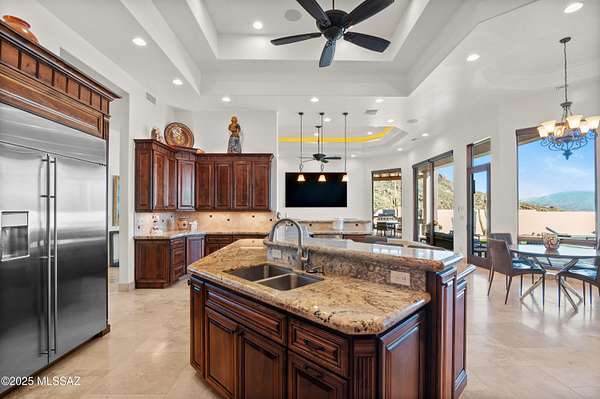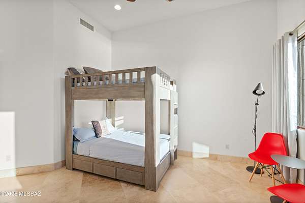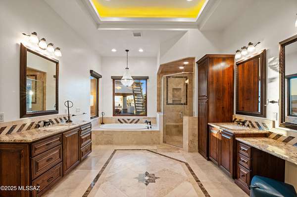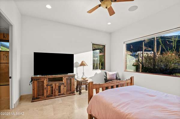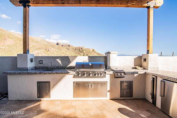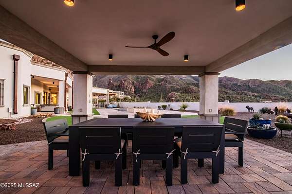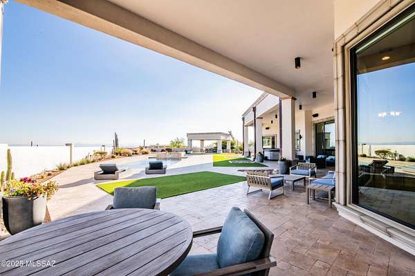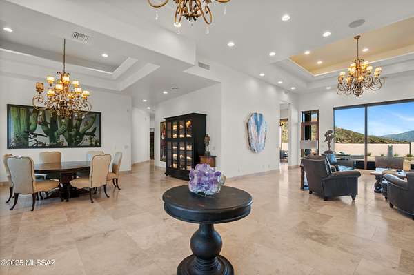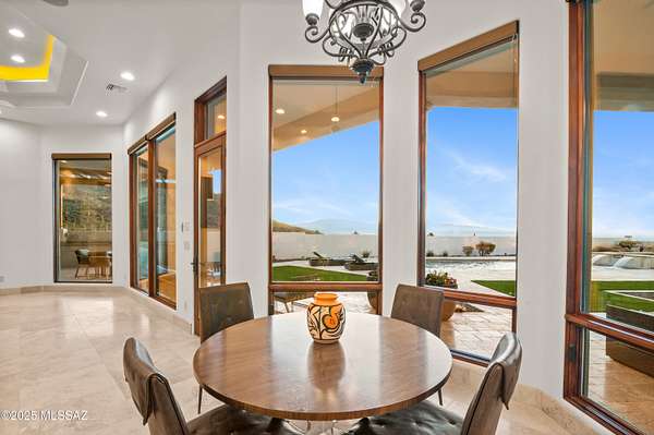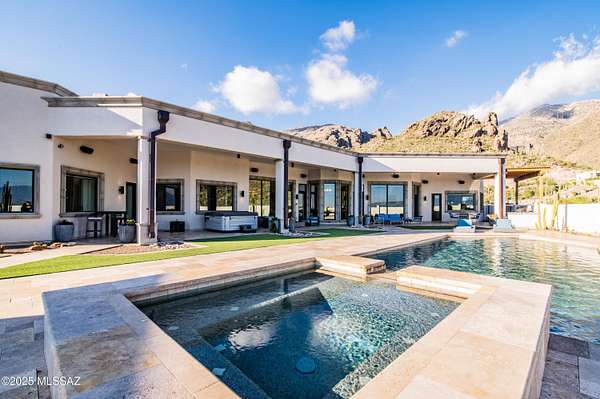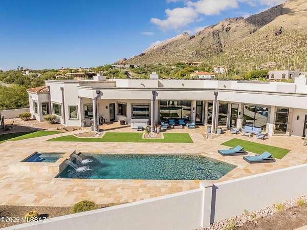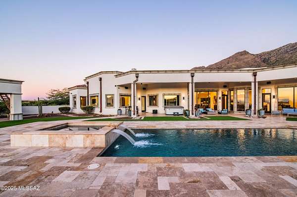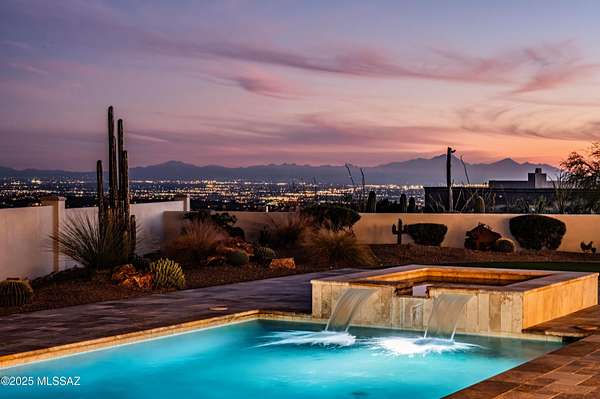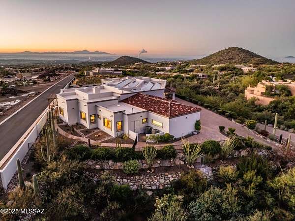 Perched at the crown of a quiet cul-de-sac in gated Finisterra, this hillside residence captures sweeping views of Ventana Canyon, the Catalina Mountains, and the city lights below. The architecture blends Mediterranean warmth with contemporary lines, creating a dramatic yet refined first impression the moment you step inside. Soaring ceilings, natural light, and thoughtfully crafted spaces guide you through a layout designed for both elevated living and effortless comfort. The primary suite feels like a private retreat, while the home's multiple living areas frame the surrounding landscape as if it were artwork. Outside, the setting truly takes over a serene backdrop of mountains, sunsets, and open desert that turns everyday moments into something extraordinary.