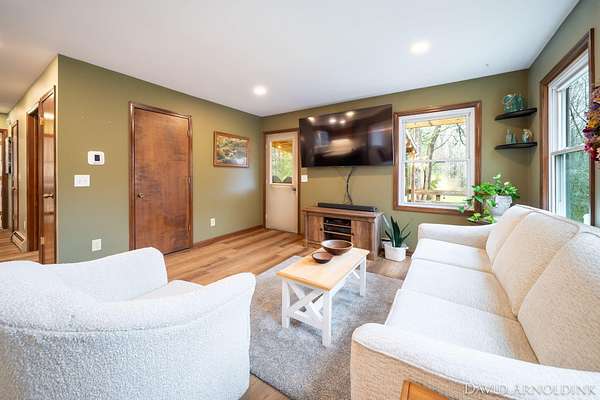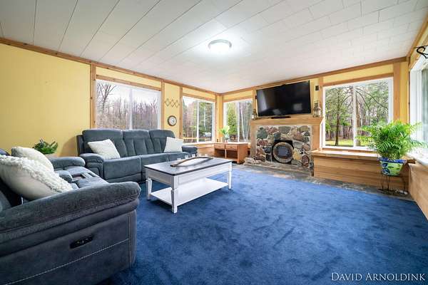 Incredible opportunity in Laketown Township for this home on a private wooded 10 acre parcel! The long driveway winds you back to the residence nestled deep into the property. Enjoy the private pond views, along with deer, turkey, and birds that are frequently seen. Inside the home boasts open living room, kitchen, and dining areas taking in the water views. The primary bedroom was recently expanded and remodeled, and features a large walk-in closet. Downstairs family room has a fireplace and nearby four season room has large windows and wood burning stove. Off the garage is an expansive mud/laundry room. The outbuilding has deep 2 stalls with storage above. There are trails and public land next door for your enjoyment. This private setting is all within minutes of Holland and Saugatuck, along with the shores of Lake Michigan beaches. Live your best life in the tranquility of this property!